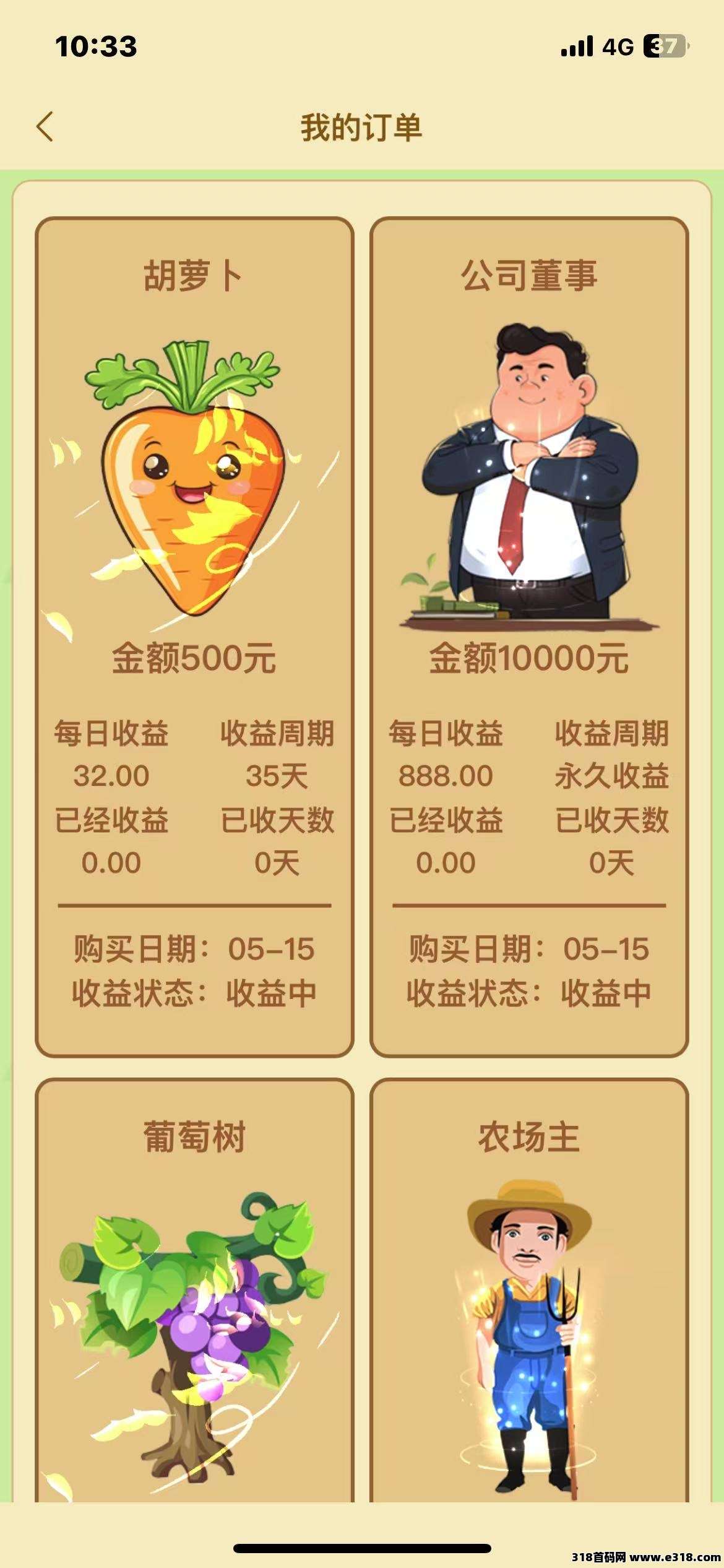 想要轻松赚取稳定收益吗?加入《农场物语》平台,你只需完成简单注册,即可获得一颗葡萄树,帮助你开启每日收益之旅。注册后,你将激活一个永久收益的机会,每天固定收入2元。而更诱人的机会来了——通过直推玩家,你将获得每个新用户的7.5元奖励,不仅能增加收益,还能享受更多的推广奖励。