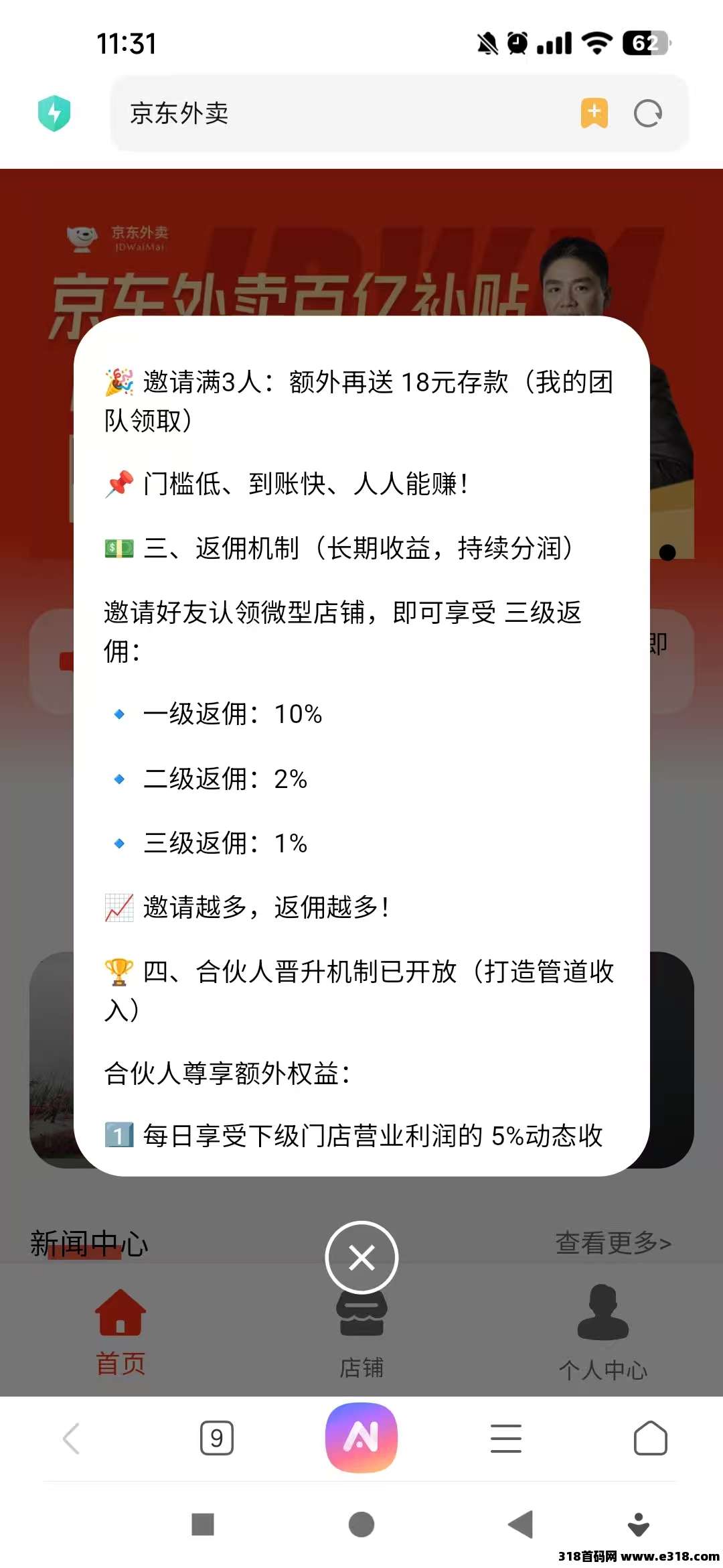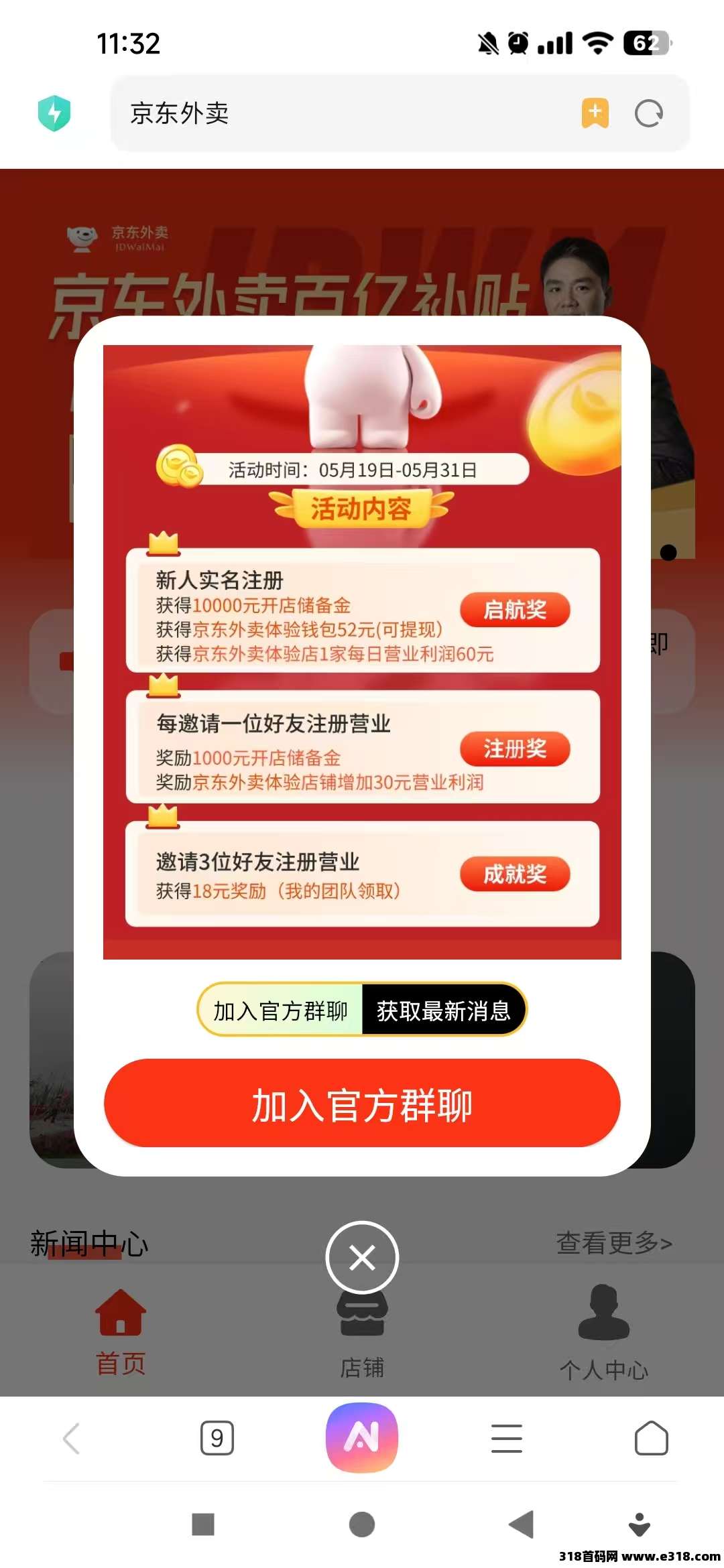 京东外卖,零撸,不需要花一分钱,每天点一下立即营业,每日可以得6,留存54,新用户52可起提(提现日周一),