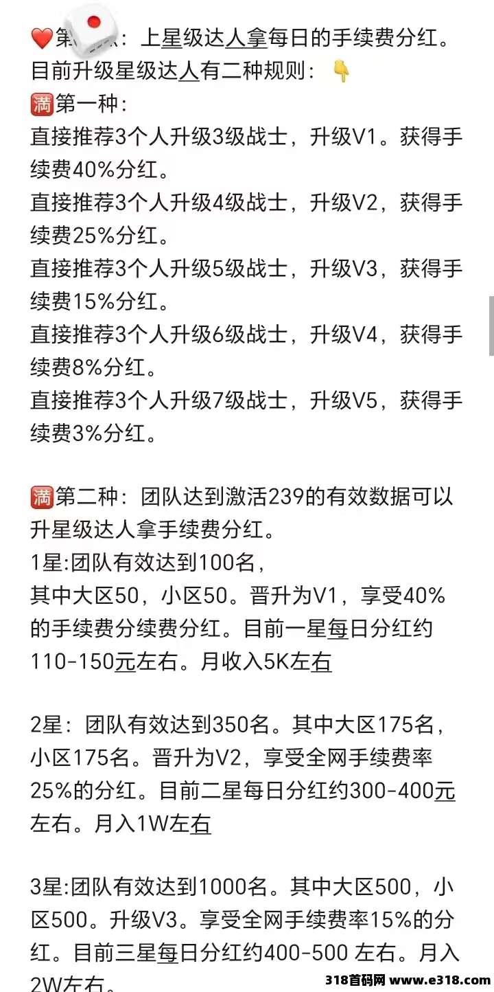5.团队100人升级V1,每天芬红120金条,团队350人升级V2,每天芬红350金条,团队1000人升级V3,每天芬红420金条,随着交易量越来越多,芬红会越来越高(禁止排线,否者永不升星)