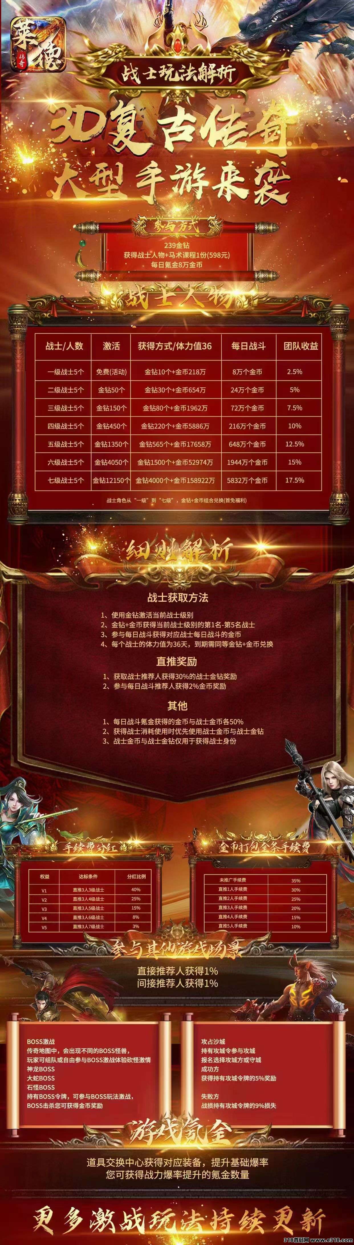 1.239金钻激活一级战士,每日产出4万金币(可交易)+4万战士金币(只能复投),36天体力值,共产出288万金币(产出的50%可交易,50%强制复投,永不下车)
