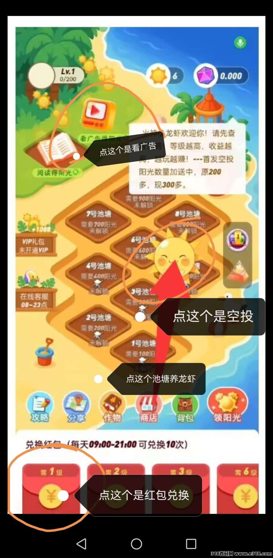 把300+阳光全部在池塘兑换虾,三分钟后上线收取直接兑换三个0.5元红包
