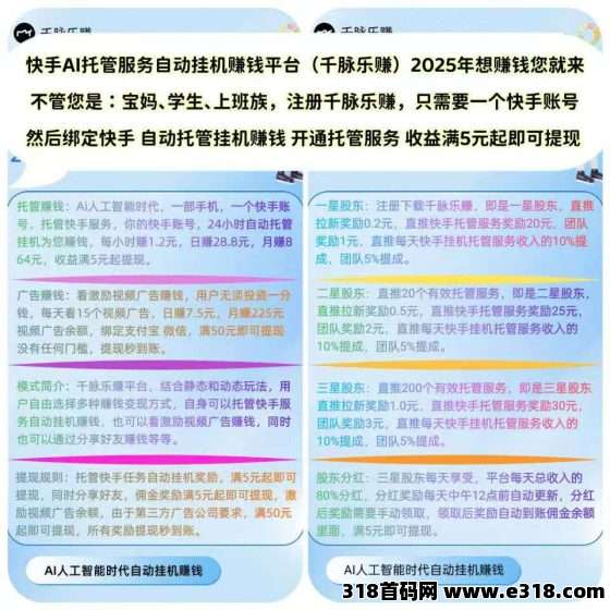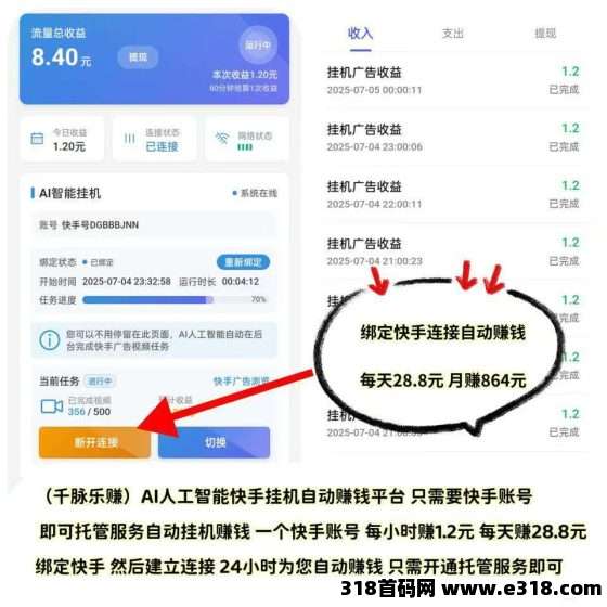 注册千脉乐赚,绑定你的快手账号,开启自动挂机功能,你的快手账号就能24小时自动挂机,为你源源不断地创造收益。每天轻松挂机就能获得288元收益,月入8640元,是不是很诱人?