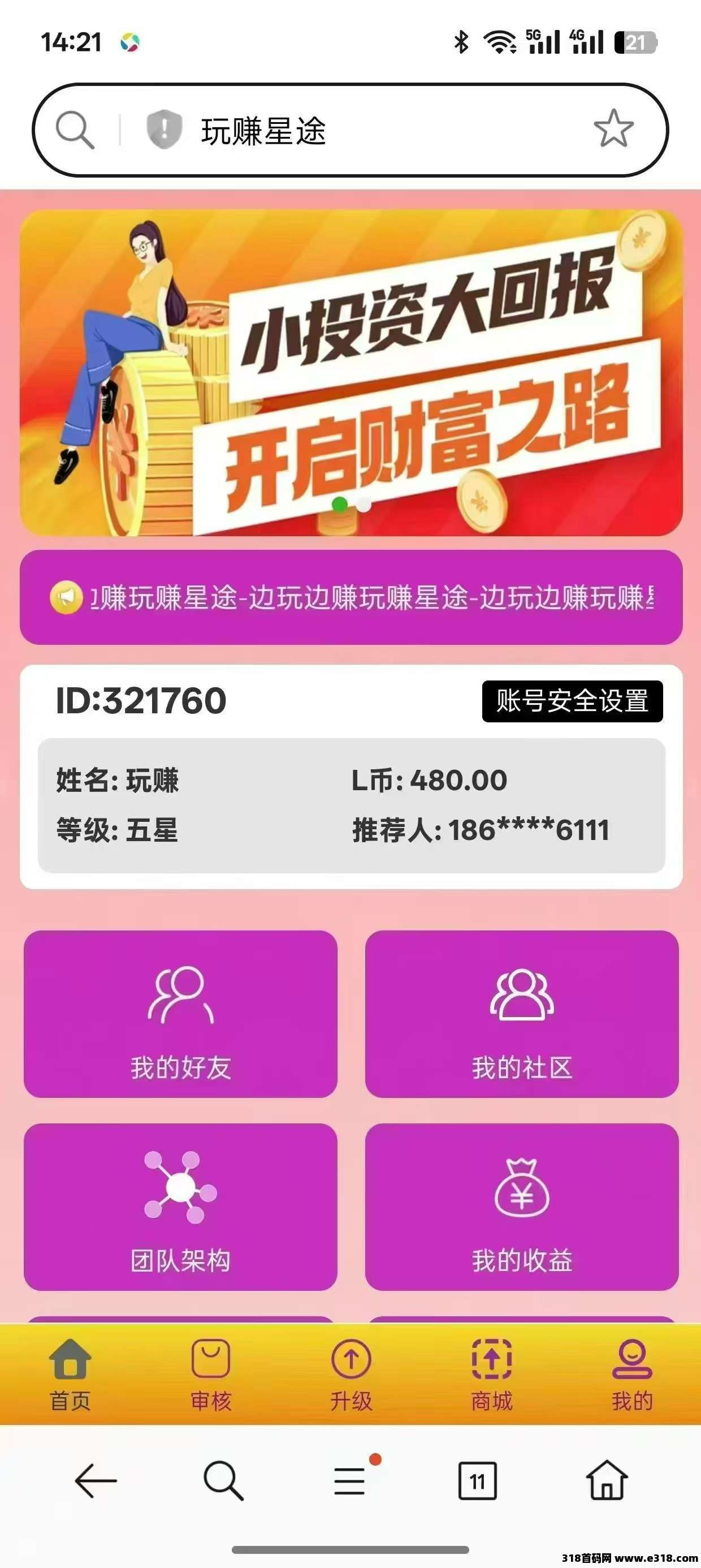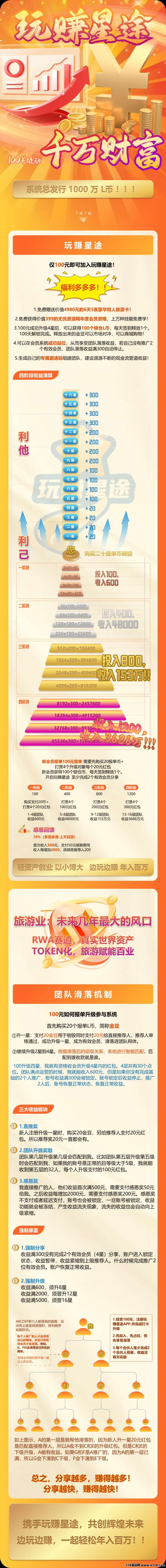 玩赚星途100块就能快速启动,**不推广最多会滑落15人收益,也就是300块,推广两个会员解锁无限滑落,收益无上限。