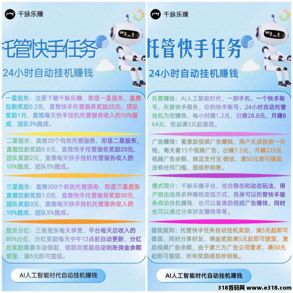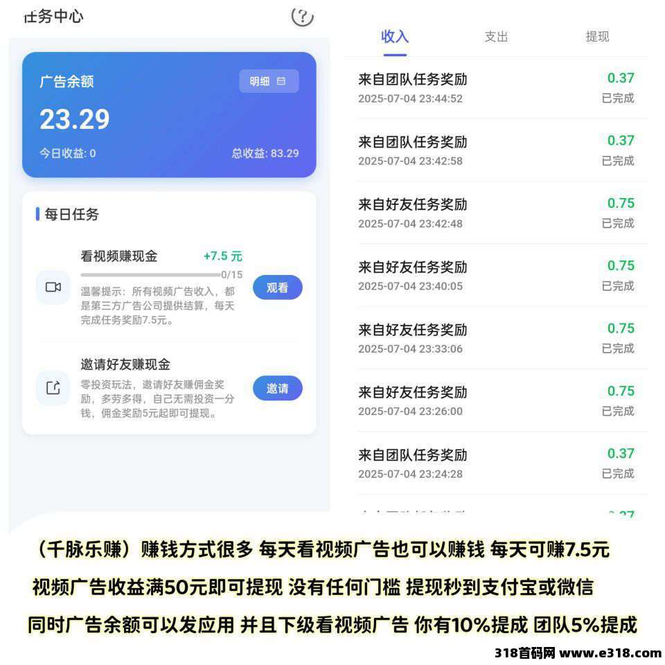 千脉乐赚首码,褂机+广告,双收益模式,**日入35元