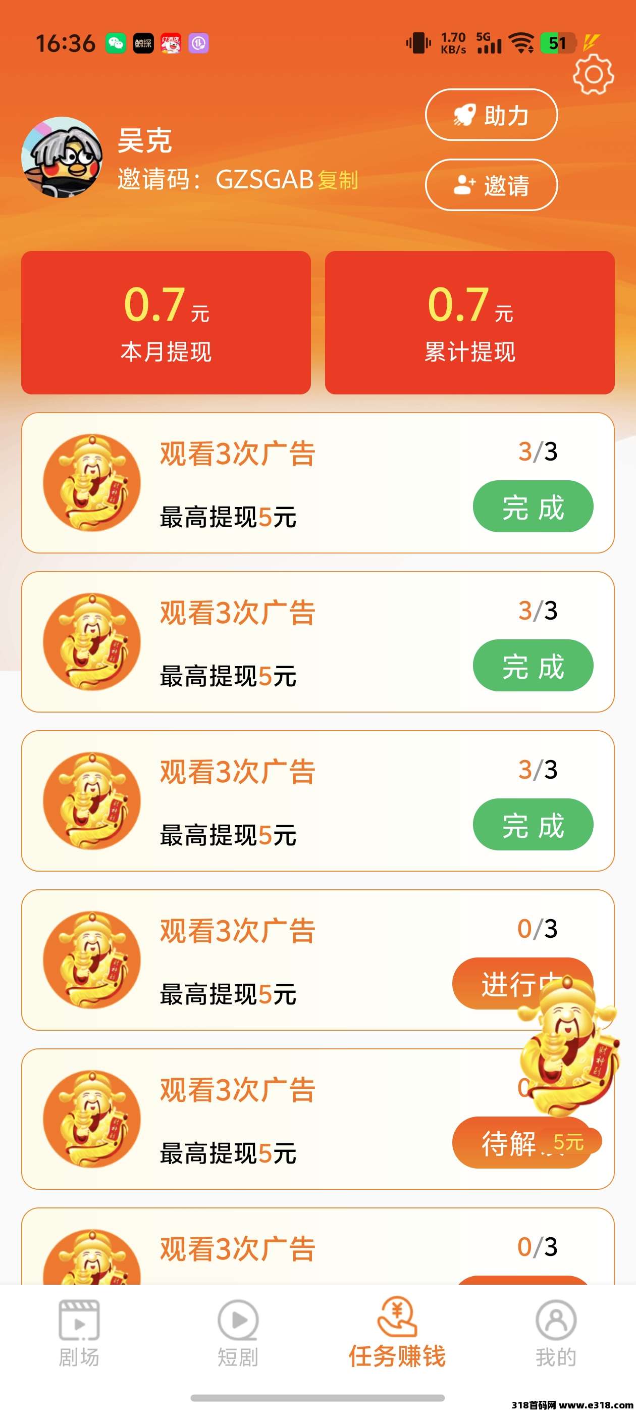 观看3条广告最高抽5元,有保底,一天可以抽20次,没有冷却时间