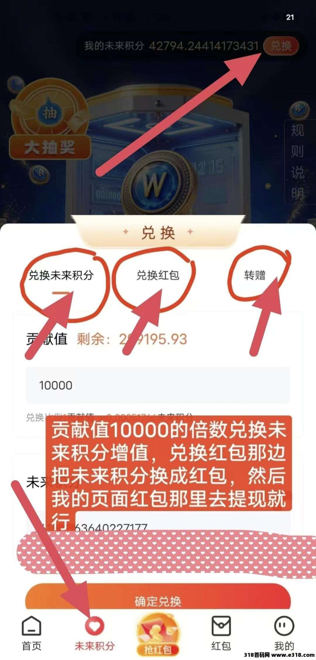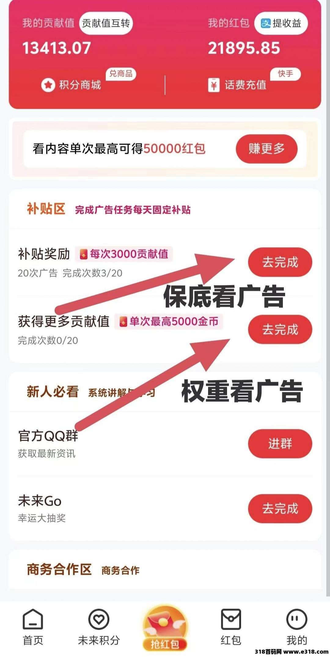 (必做)每天看完15个保底广告获得贡献值!保底2.16米!贡献值兑换未来积分,以10000的倍数兑换(未来积分每日增长5%-30%,单机月入400+)。未来积分兑换红包(可以不换,等待积分增值后兑换即可)。