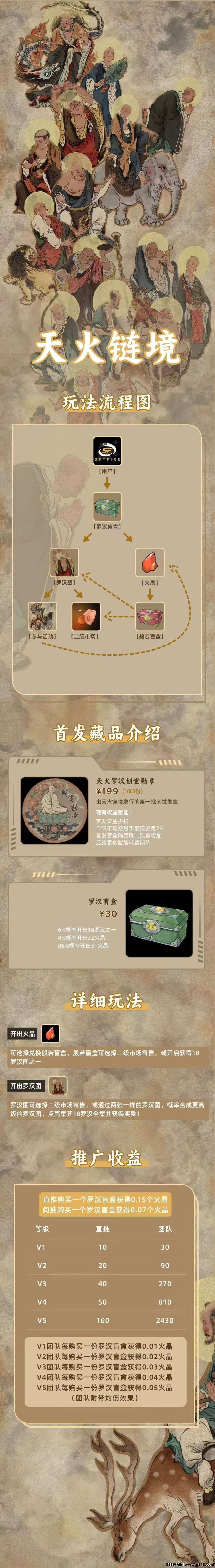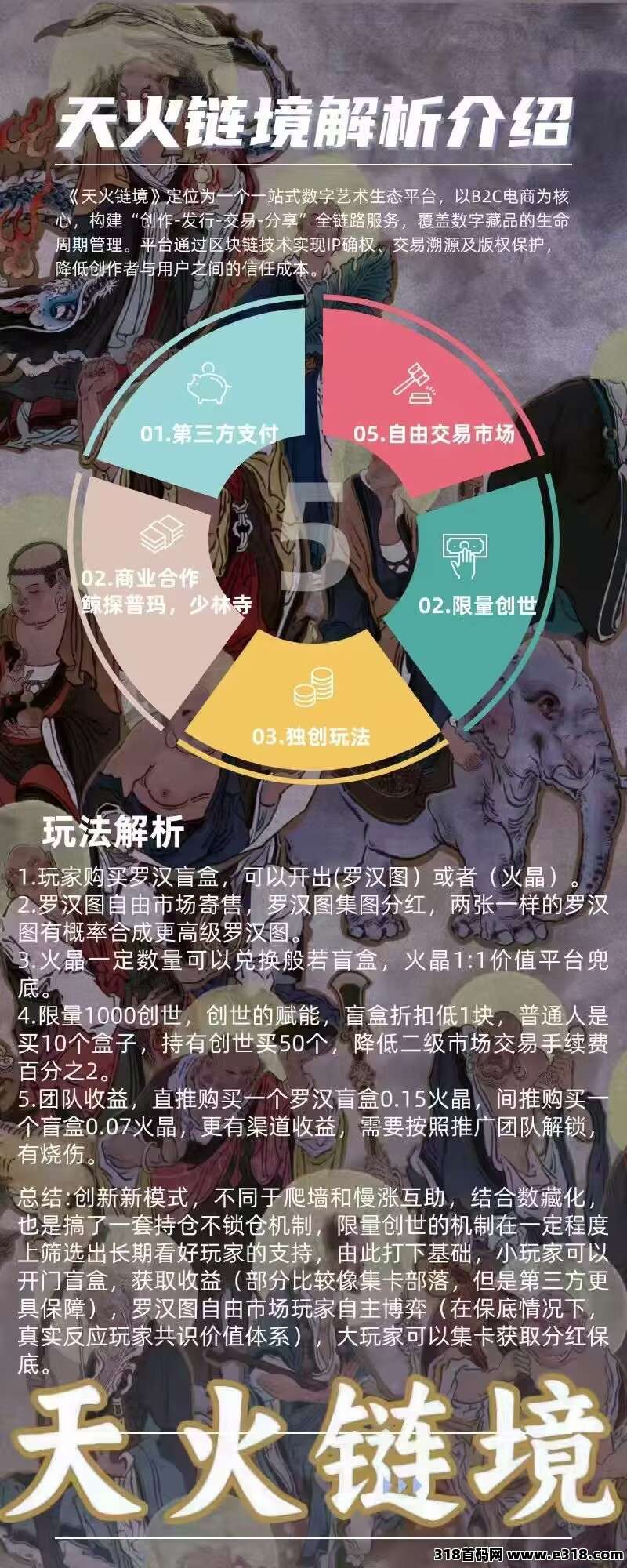 链游+数藏+繁育+实物,独创模式实物赋能,附带直播拆卡玩法,与嵩山少林寺以及鲸探合作的IP,预计8月10号上线。