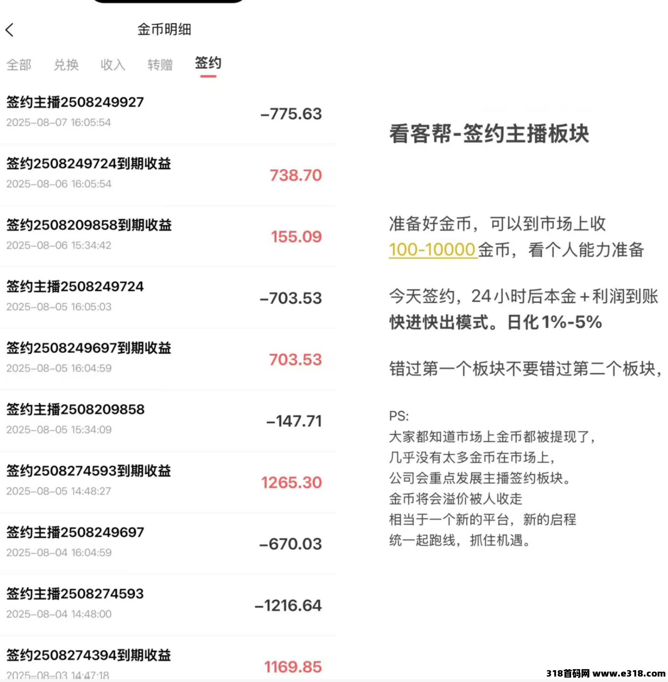 简而言之,我们可以根据自己金币情况,投入100-10000金币不等签约主播,投入这些金币作用就是锁仓一天之后可以根据主播收益获得**大概利润在1-5%之间,意思就是投入一天之后立马可以获得回报周期非常短,当然这个门槛不高(低级的100多金币就是十几块即可),但并不是人人有份的,我们会看到主播倒计时功能,意思就是说需要准点开抢,名额有限先到先得如果抢到就稳赚了。