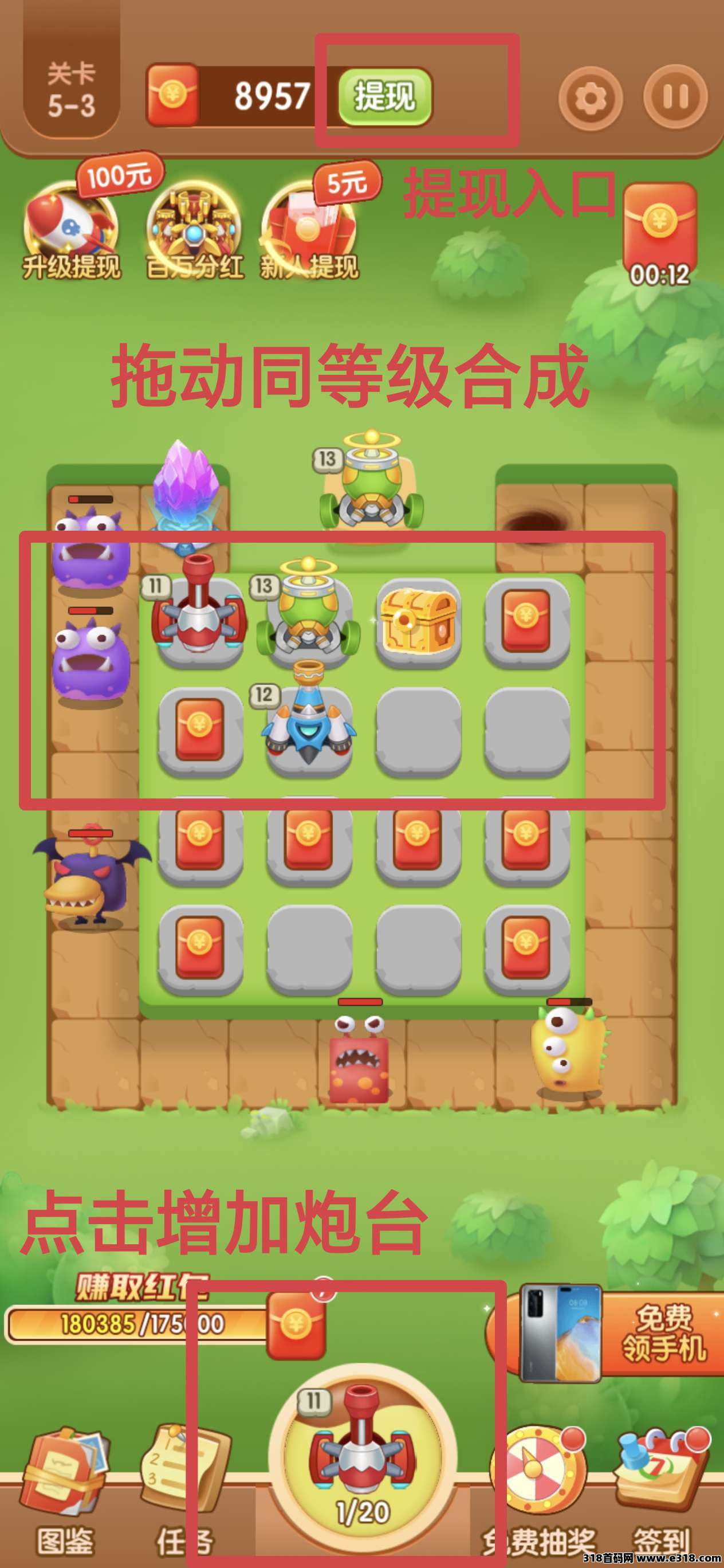 首码怪兽塔防~广告赚,游戏赚,零撸保底收益高,开局奖励个炮塔,合成游戏,自动打怪赚米!浏览器扫码