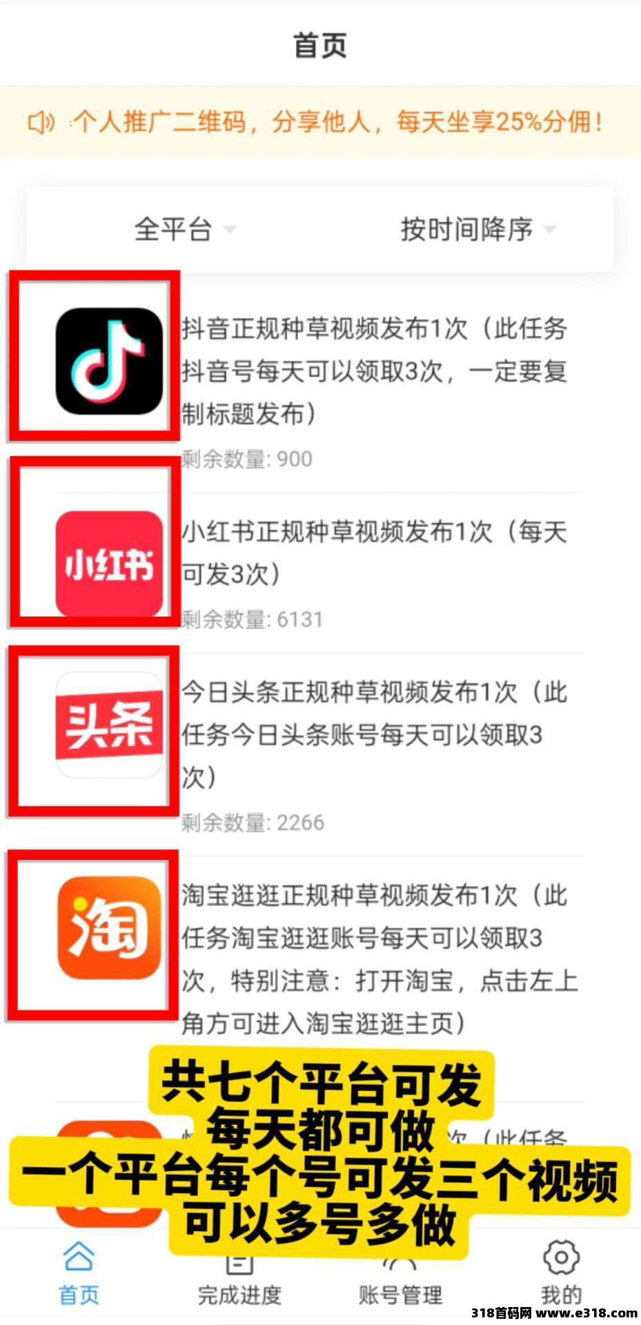 【代发视频】抖音,快手,小红书,视频号、淘宝、B站、微视七个平台可代发,独立后台,按播放量计算收益,还能养号,平台提供素材,正规绿色视频