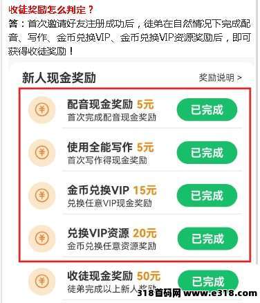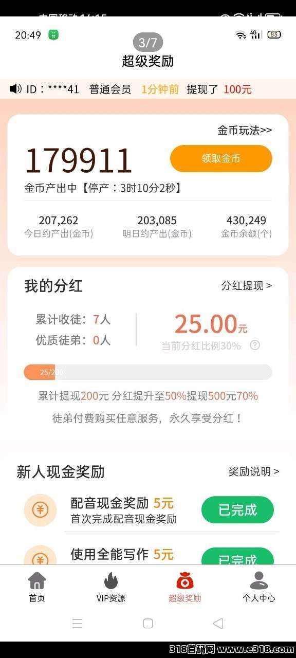 尚配音0撸挂机7代收益,全新玩法!尚配音芬红,完成新人任务直接领95米,推一个给50米,提现500最高拿70%芬宏,后续还会推出金币兑换实物等玩法!零撸挂机赚金币**每天1米,团队滑落模式,推广7代收益!配音文字还有额外收益10000金 B =1元(可提致富宝]活跃度高=指数高自己与7级徒弟昨日指数高=今日产出就越多