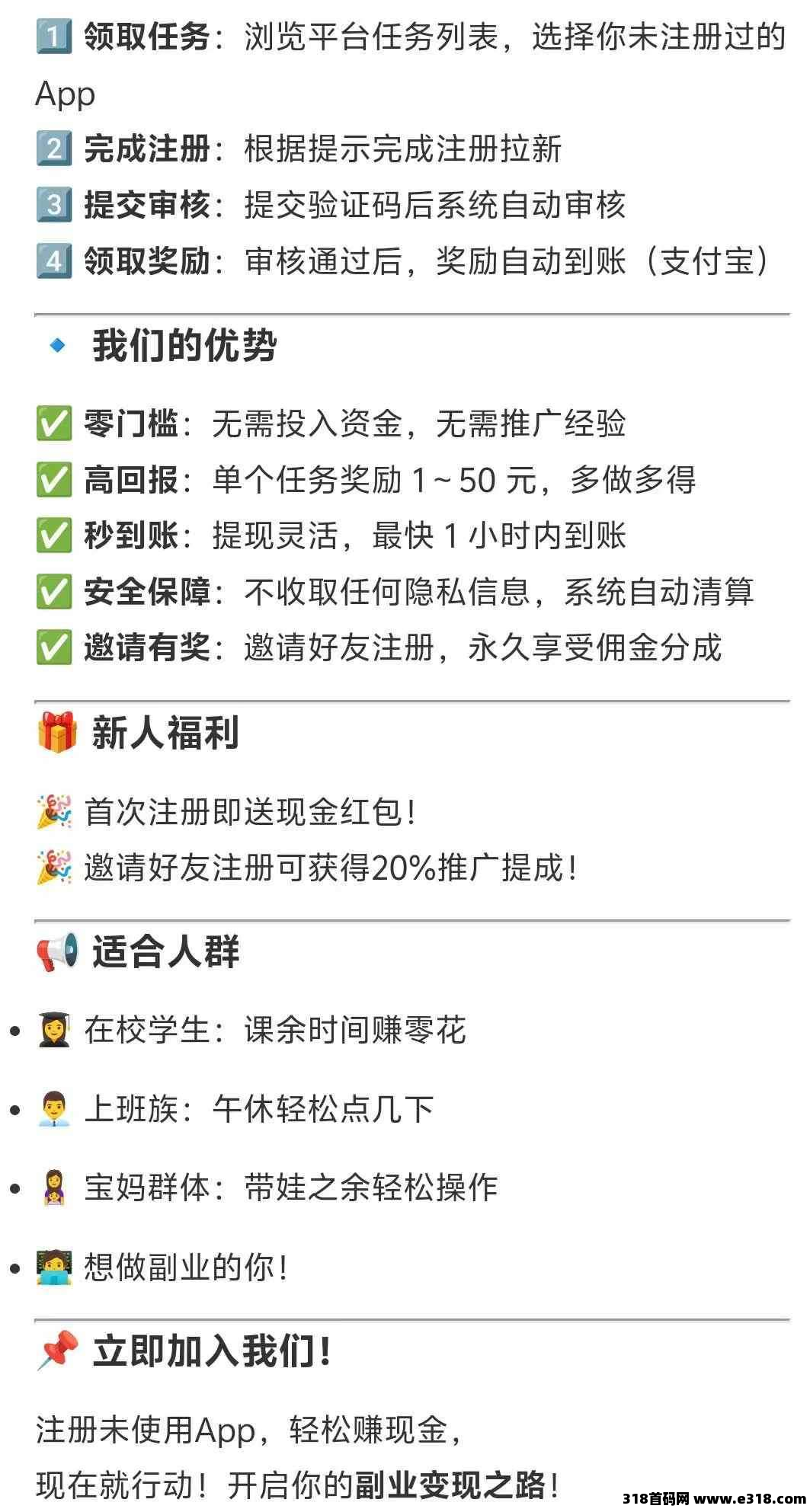 与多家知名应用开发商合作,所有任务经过严格审核,确保安全可靠。