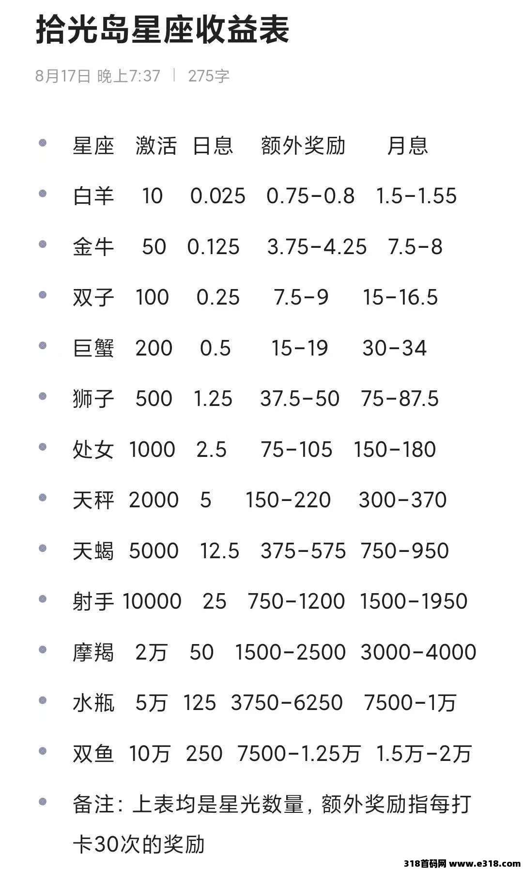 花费20星光,购买拾光匣即可成为VIP,无需看广告,仅需几秒钟完成点赞打赏即可完成任务,每天产出1星光,40天产出40星光,利润相当可观。每分享8个人开启拾光匣系统自动赠送一个 ,相当于20个星光,可以转赠出售
