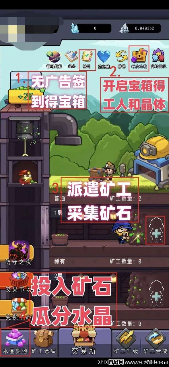 每日无广告签到得宝箱,宝箱开矿工,矿工可升级升阶,矿工采集矿石,矿石参与瓜分获得水晶转赠,和超级链接老虎金币一样,前期润高