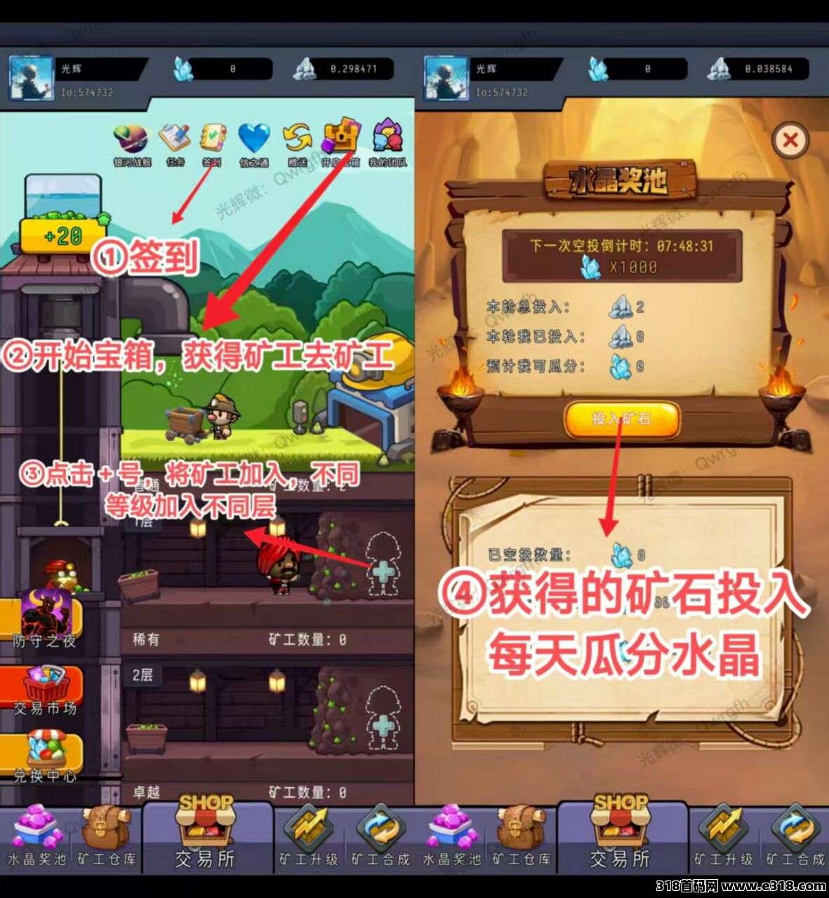 致富宝授权,每日无广告签到得宝箱,宝箱旷工,旷工可升级升阶,旷工采集旷石,矿石参与瓜分获得水晶转赠,和超级链接老虎金币一样,前期润高,