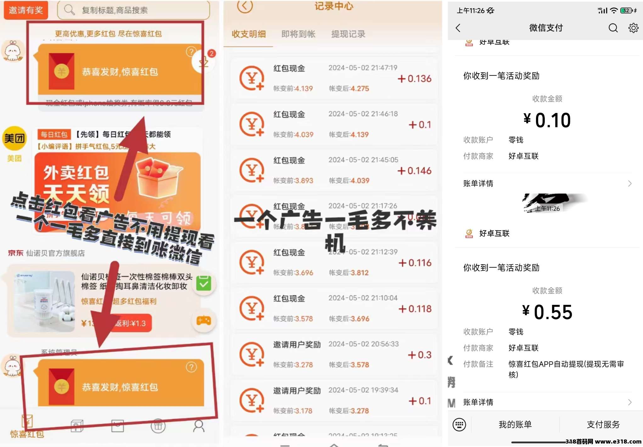 已上架各大平台,可无限0撸,每个广告0.1左右(广告若加载慢请耐心等待),每天第5、第10个红包固定大于0.1,平台不用自己提现,满0.1自动秒到微信