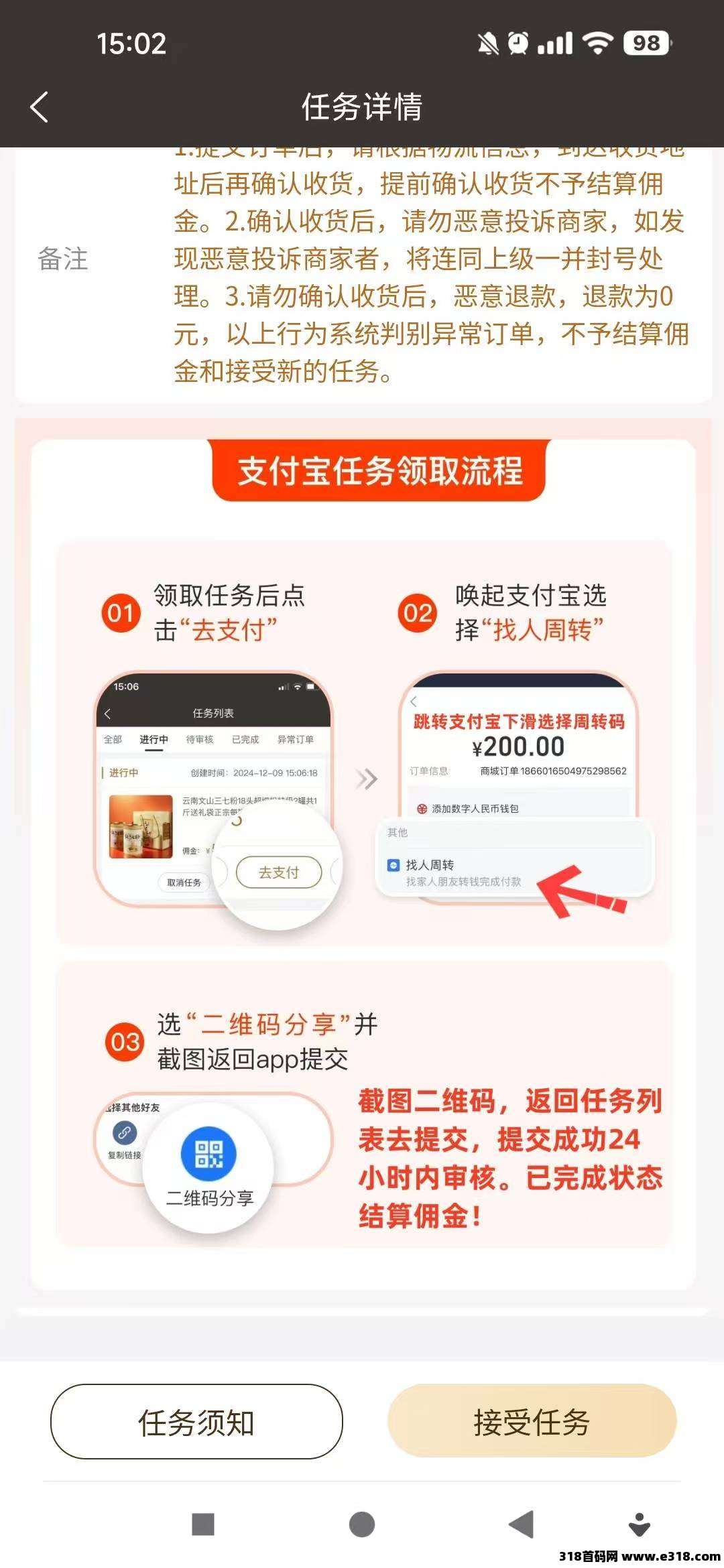 ②全程不需要自己支付一分米,点支付跳转支付宝拉到最下面有个转他人周转支付,只需要截图周转支付码提交任务就可以。