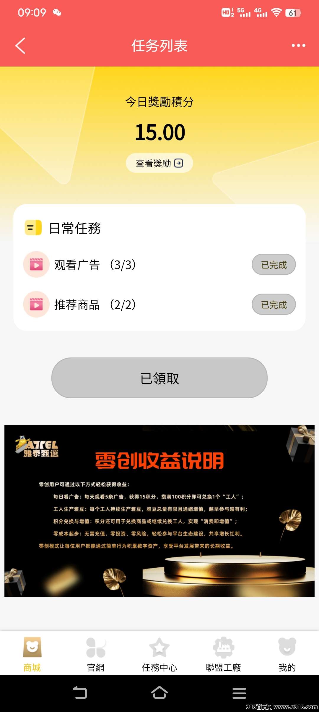 每天三个广告二个浏览任务,只需要1分钟完成。每天领15积分。7天就是105积分。用100积分兑换一个工人。工人每天生产雅豆。