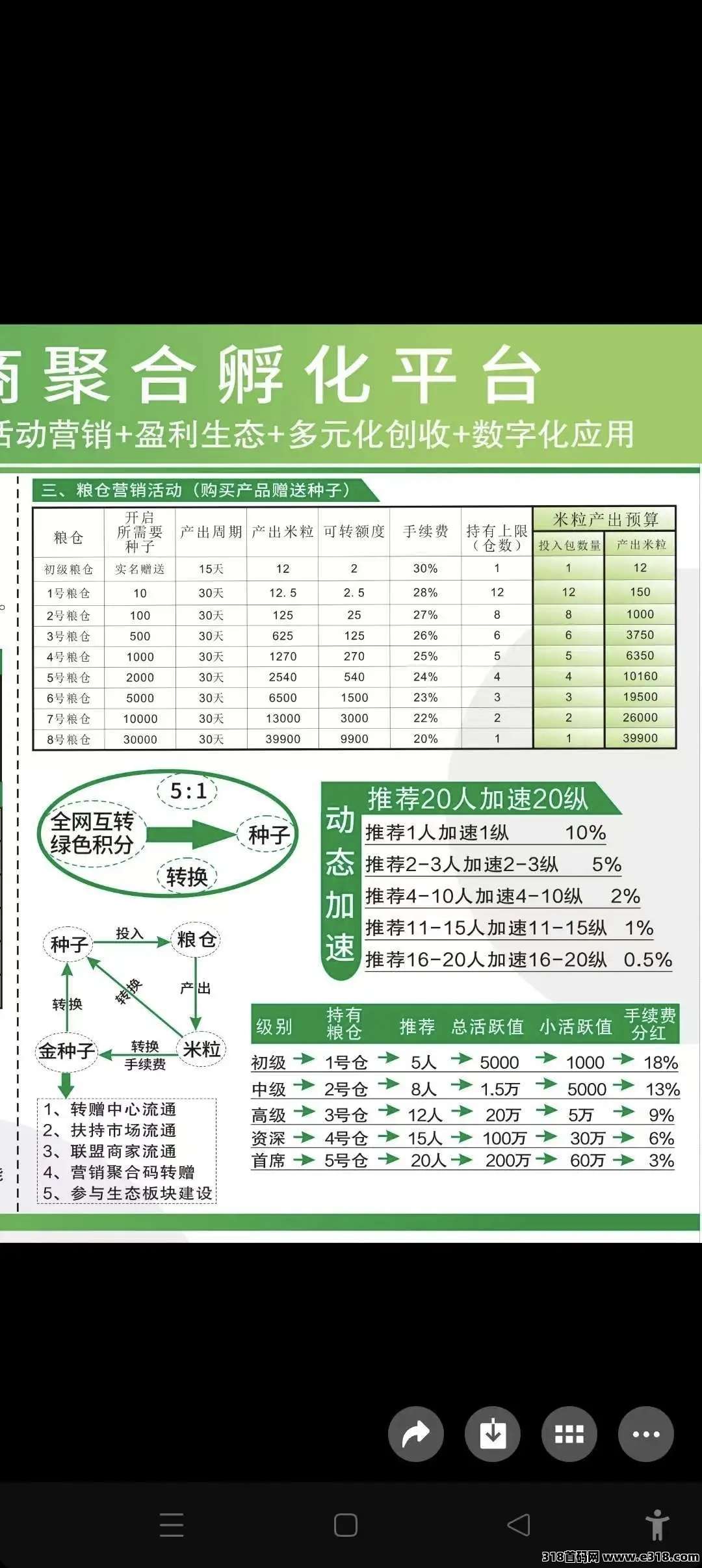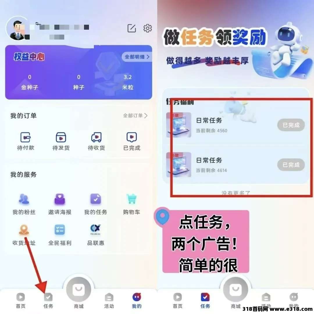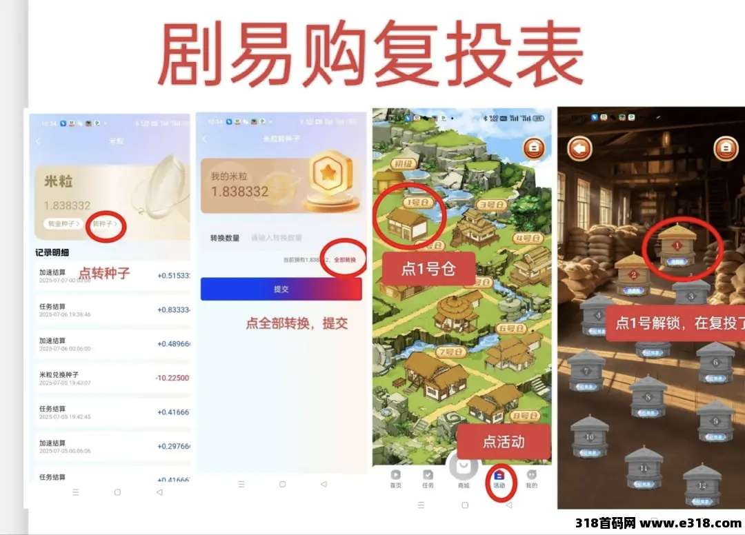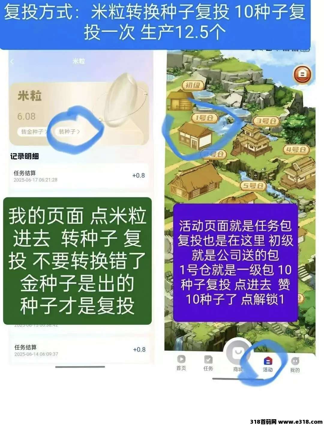 新卷轴剧易购,有礼有据模式,实名会员送一个初级包每天产0.8米粒,我们的米粒释放出来可以换种子上包,5米一个,有线上,线下消费全返模式,勇2(连续三天任务)每次复投勇1➕一星48.8二星188.8