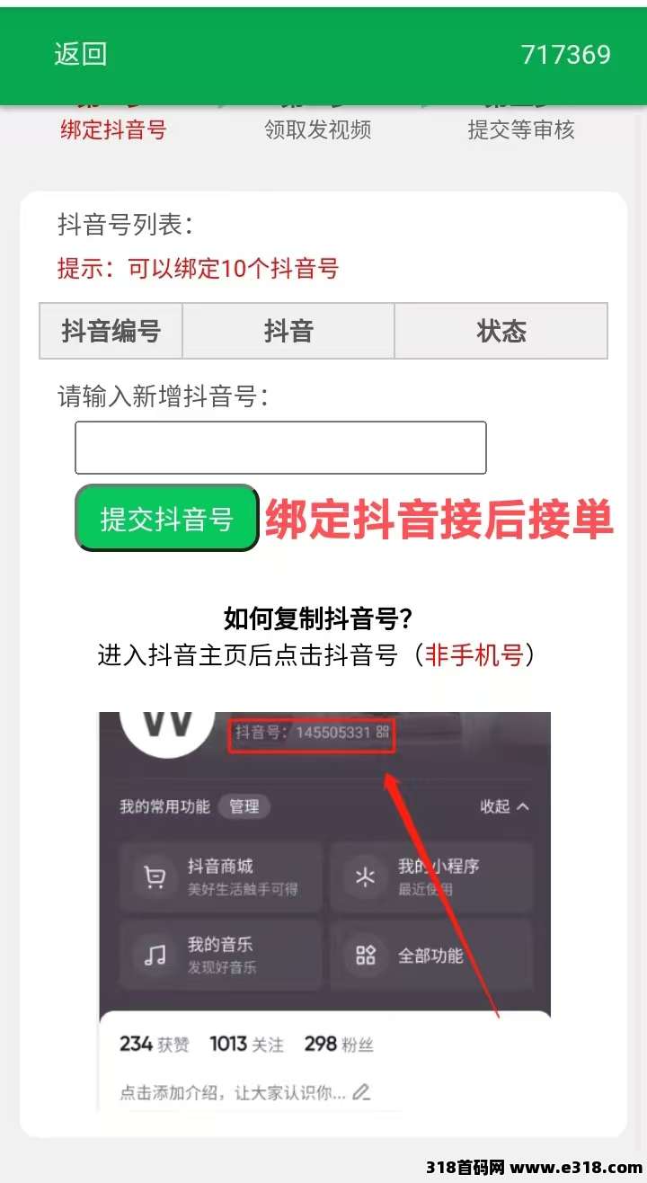 1、绑定唞音,把平台提供的种草视频发布到短视频平台即可,1分钟可完成。