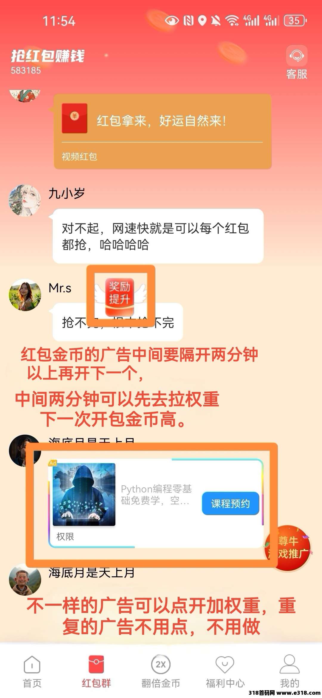 5. 权重提升:间隔的两分钟内可拉权重(除金币红包外,其他广告均能增加权重),建议将权重涨到6000后再开下一个包。