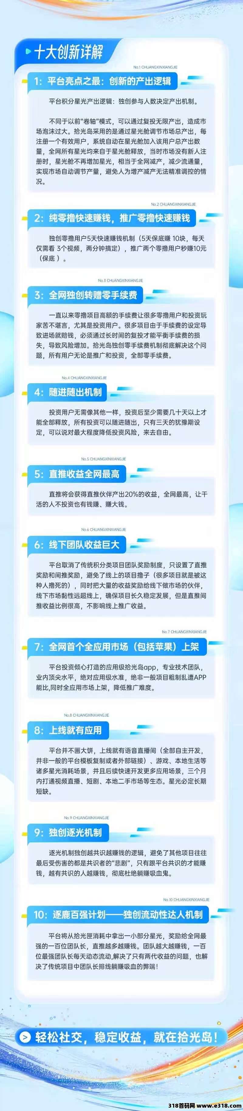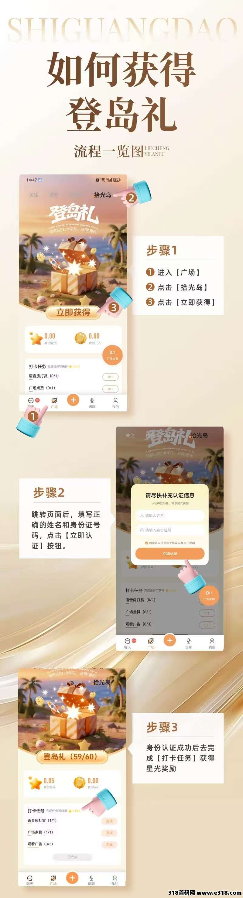 一、拾光岛是一款刚上线的新项目。下栽安装后,先在我的-编辑资料绑定上级信息,即可正式开启任务。平台设有打咔奖励,每次领取0.05星光,邀请人能额外拿到0.5星光。实测数据显示,连续5天累计可提取11.5圆