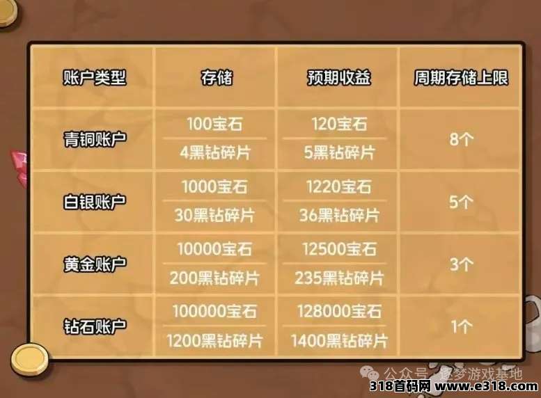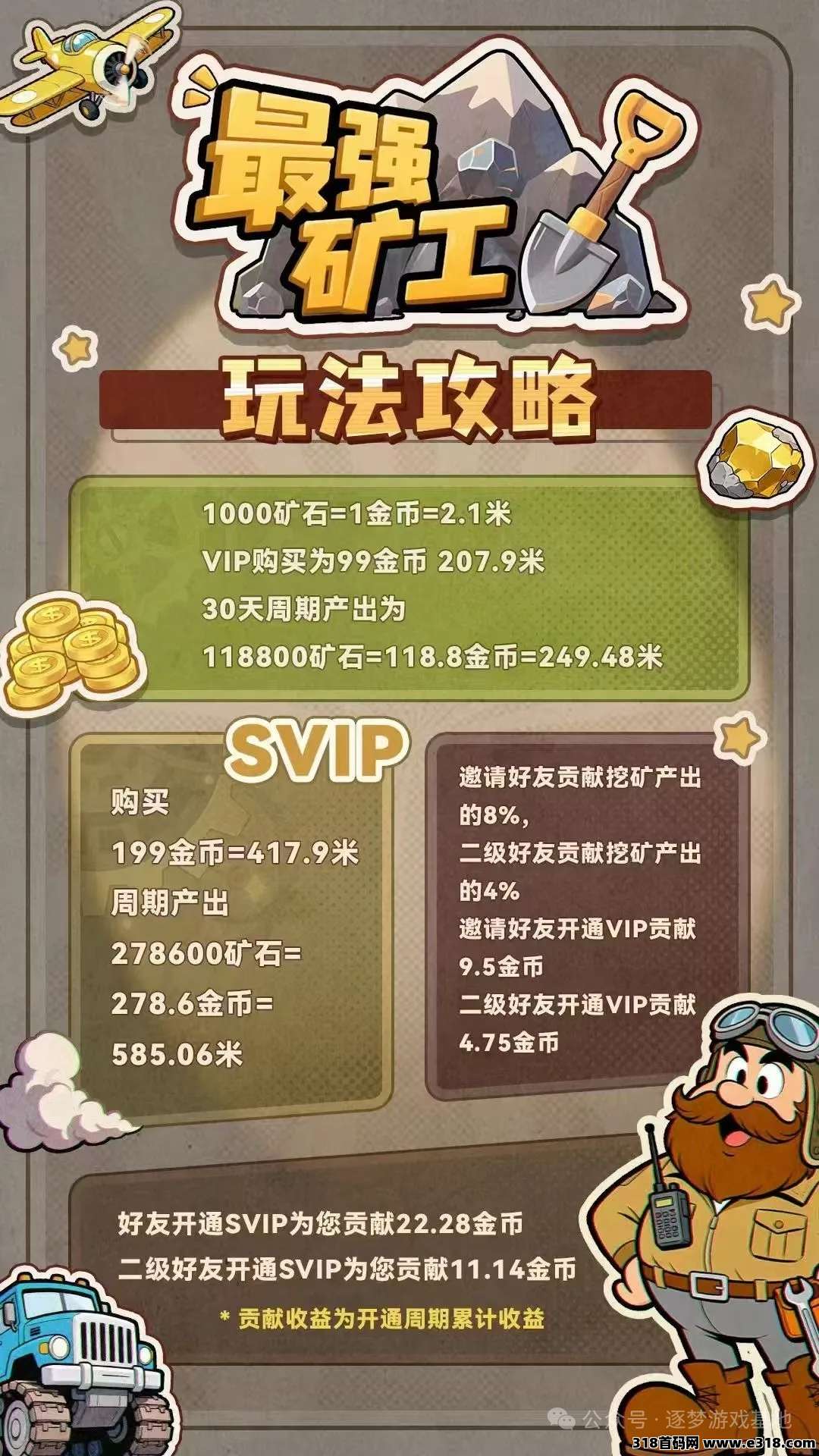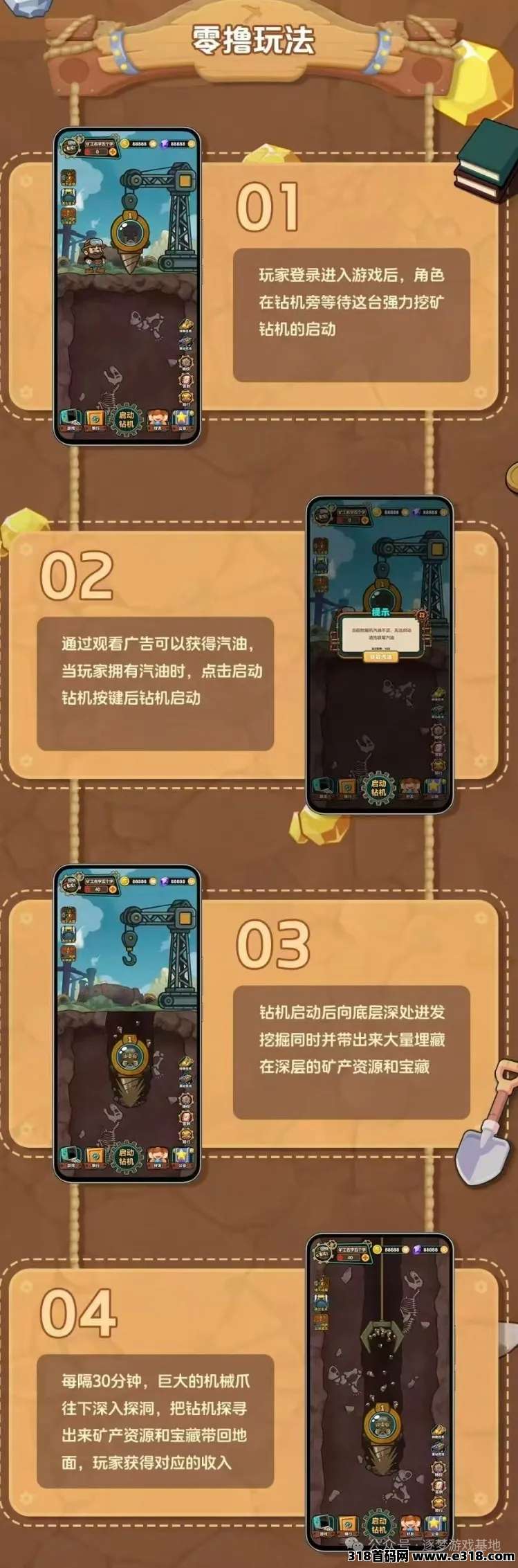 ①零撸玩法玩家登录进入游戏后,角色在钻机旁等待**钻机的启动。通过观看广告可以获得汽油,当玩家拥有汽油时,点击启动钻机按键后钻机启动。钻机启动后向底层深处进发挖掘同时井带出来大量埋藏在深层的矿产资源和宝藏。然后带出来的货物可以进行变现②氪金玩法平台推出两种VIP卡208米开启VIP权限,获得中级钻机,免广告,30天周期,获得118800金币,月利润20%,润42米。418米开启SVIP权限,获得高级钻机,免广告,30天周期,获得258700金币,月利润30%,润126米。1000金币=1宝石,1宝石=2米。