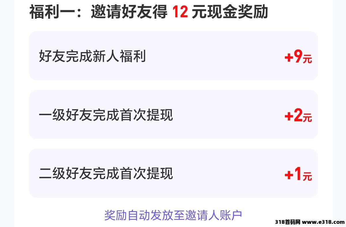 一、邀请的一级好友完成并领取新人福利成功奖励您9元。邀请的一级好友首次提现成功奖励您2元,邀请的二级好友首次提现成功奖励您1元。