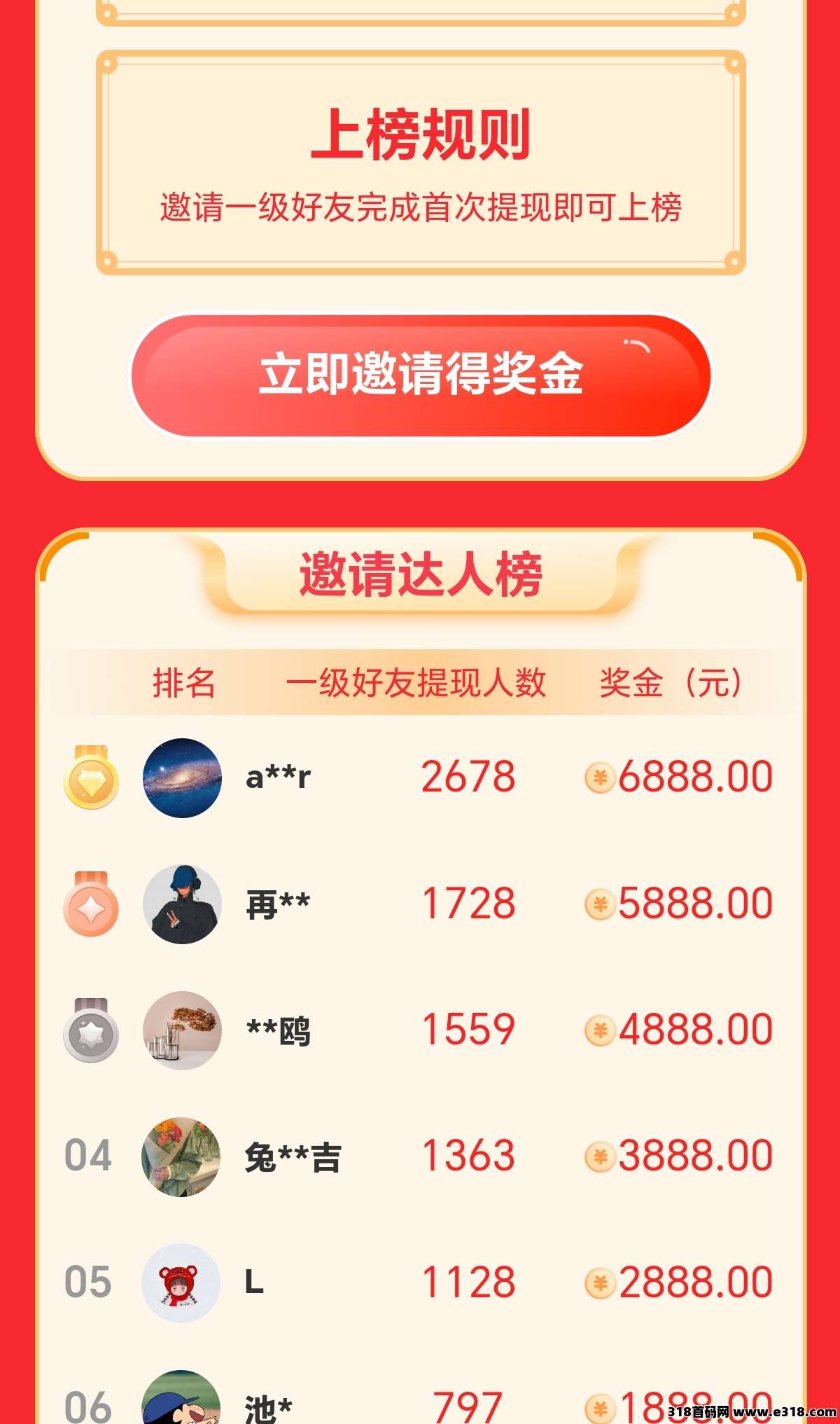 四、推广奖励:统计活动期间内邀请的一级好友提现人数(好友需完成截图任务(非秒审任务)大于0.7元,并首次提现成功,才会列入统计), 奖励以每期活动结束时间的排名为准,奖励会在活动时间结束后24小时内自动结算到我的账户余额。