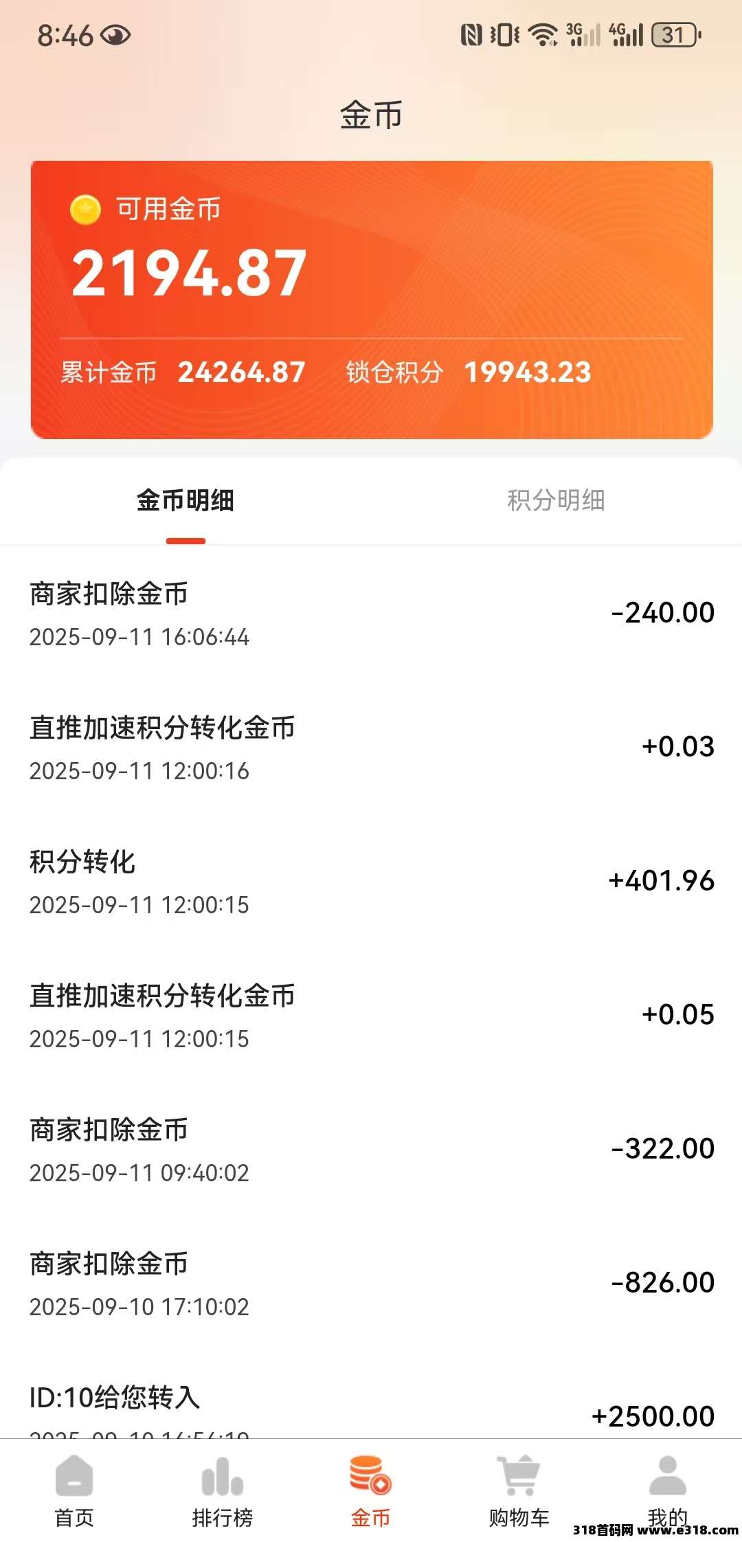 积分1:1兑换金币,可以用来购物,可以兑换现金,也可以兑换大神联盟群的积分,每天签到送2积分,购物返积分,每天释放2%,想要加快释放就多推广,推广可以加速释放,他消费你还有奖励