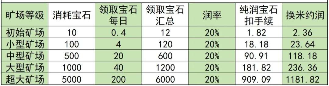 宝石新用途:激活矿场:所有宝石可激活虚拟矿场,开启稳定收益!矿场分五级(初始到超大型),基础收益率统一20%,满足不同玩家需求——小额投入,高额回报!