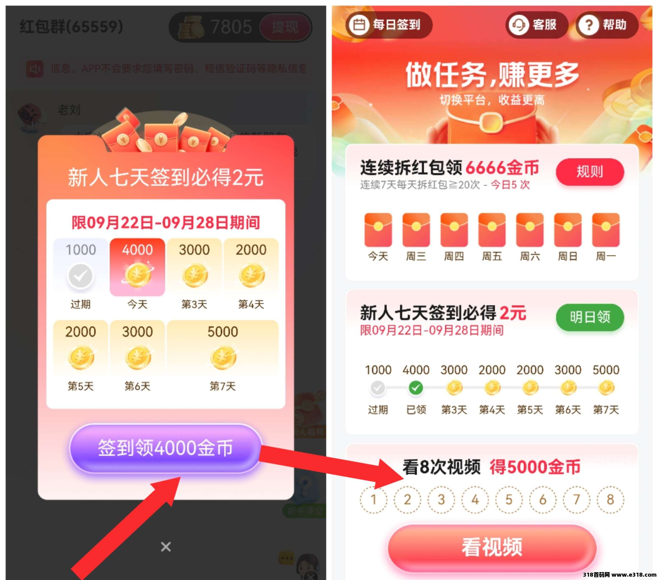2.每天拿下签到奖励,连续签到7天2元,如果没看到8个广告0.5元低保,就得去红包群领几个红包后触发。
