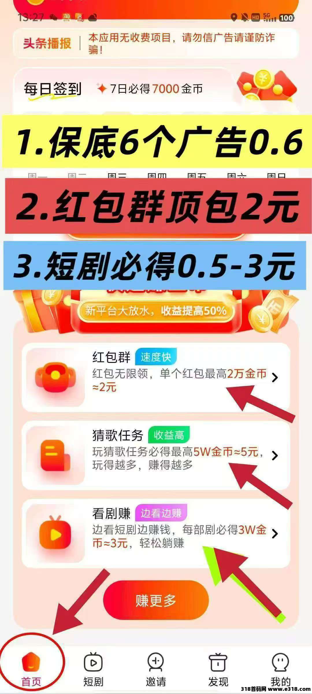 保底玩法: 看短剧➕签到每日约4米➕