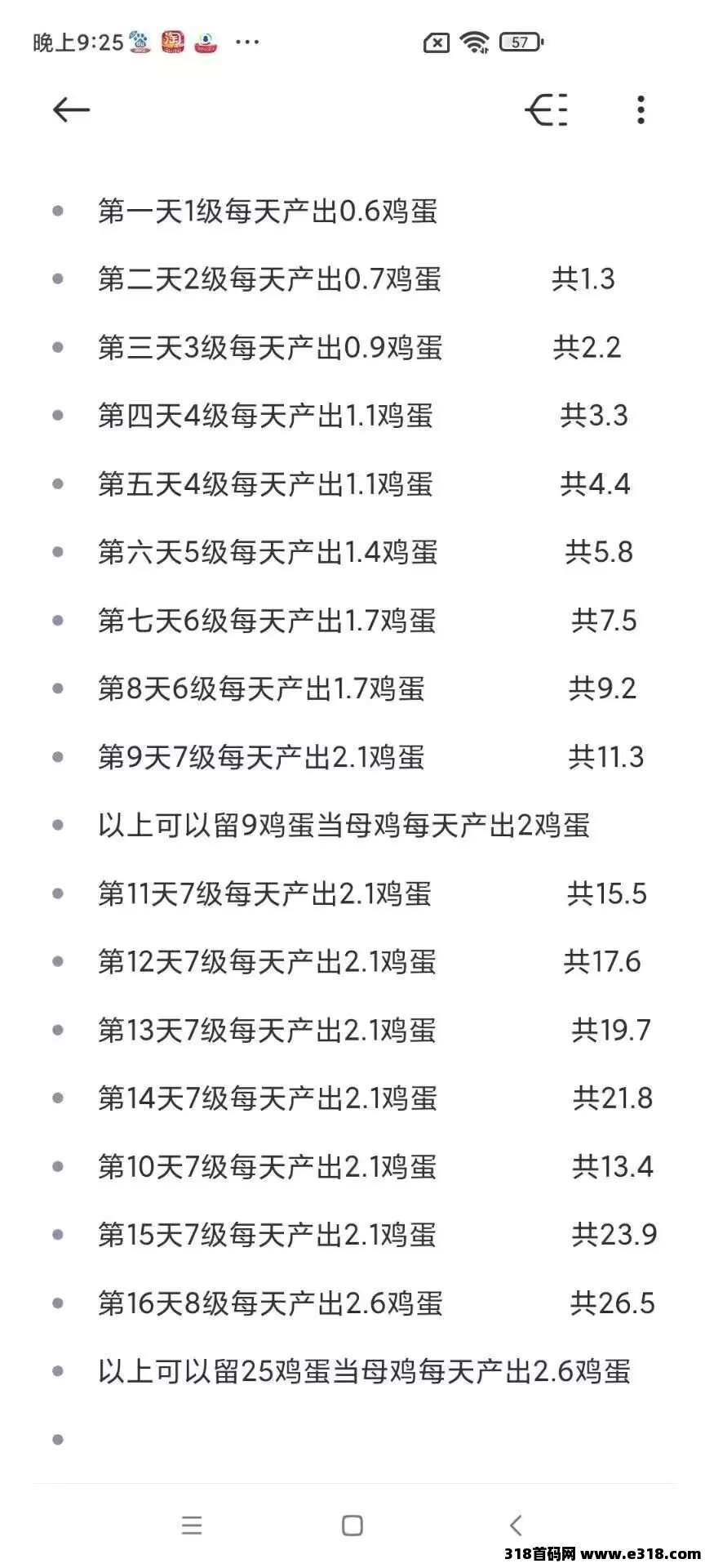 免费必撸,10月9日正式上线,看5个视频然后类游戏,当天注册做完任务第二天有0.5个鸡蛋。升到6级,每天产出1.7个鸡蛋。目前后台集市- -个鸡蛋2.5元,黑市和咸鱼,3.5元-一个秒卖。