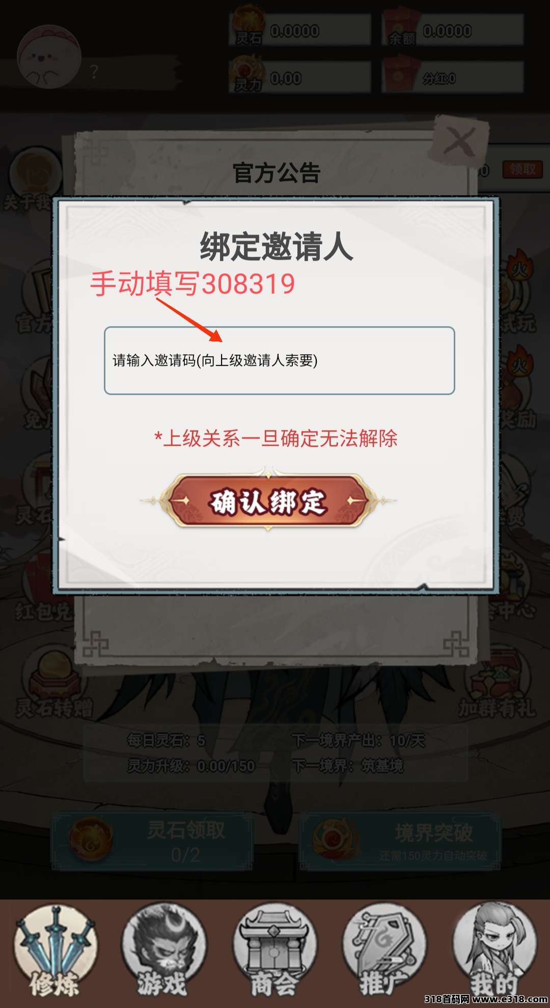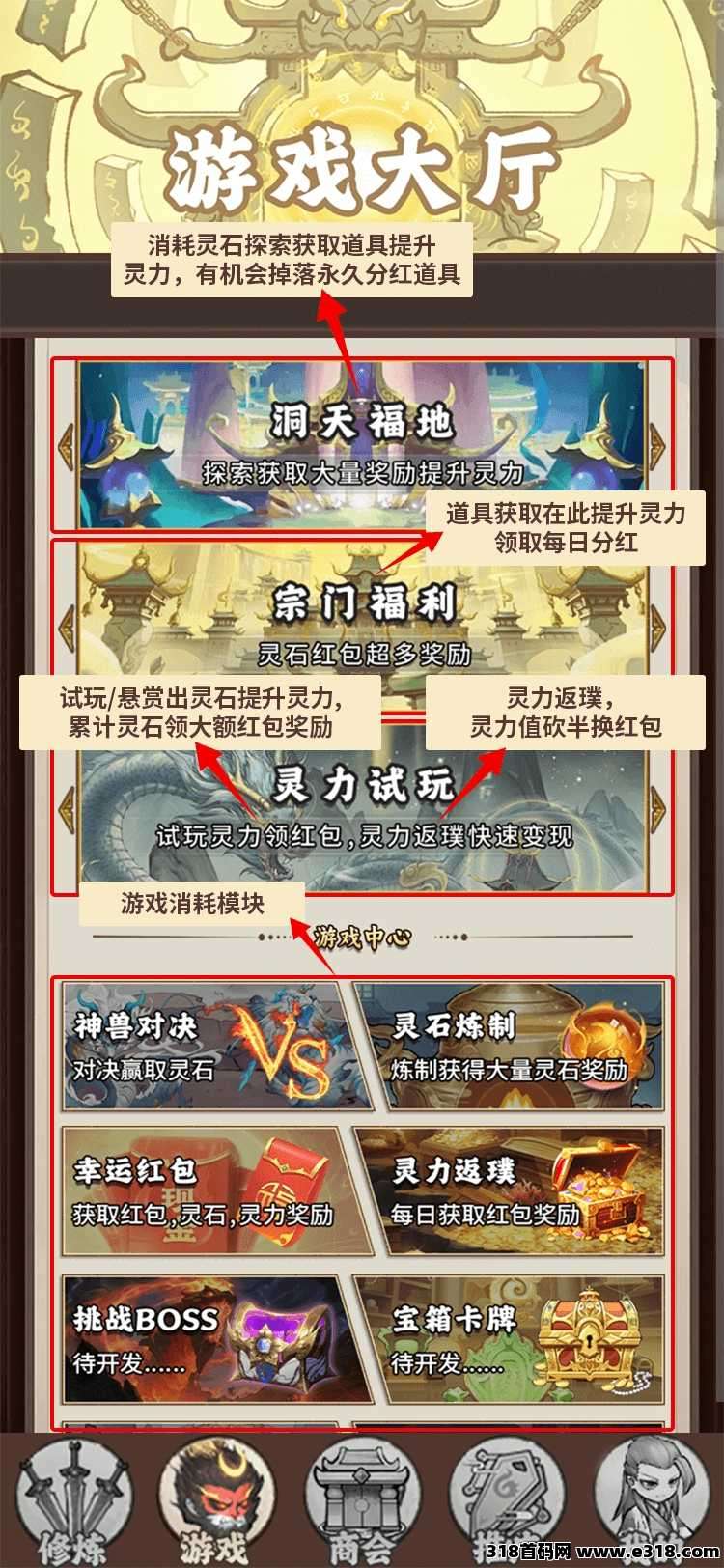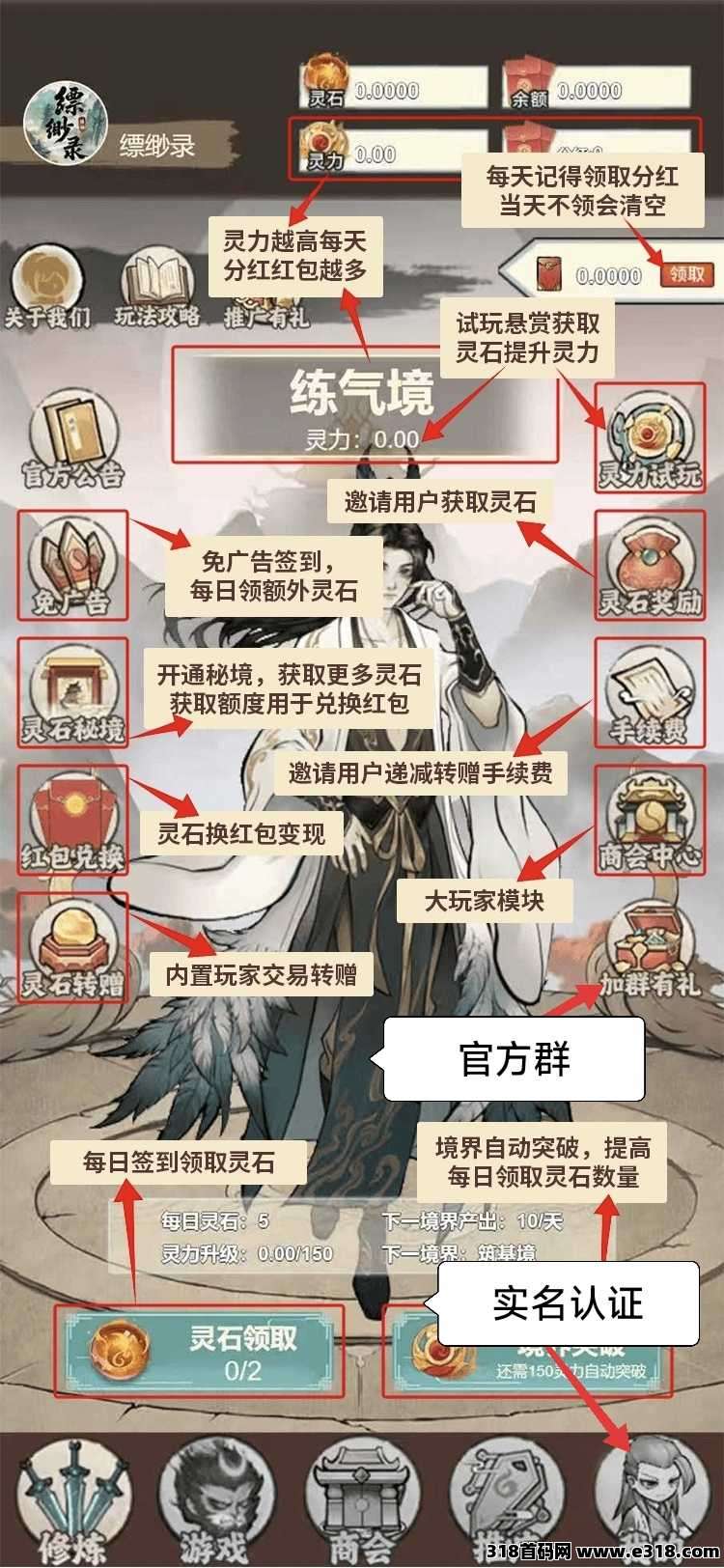 游戏核心玩法是通过消耗灵石获取灵力来提升修炼等级,等级越高每日灵石产出越多。持有灵力可享受芬红和境界红包奖励
