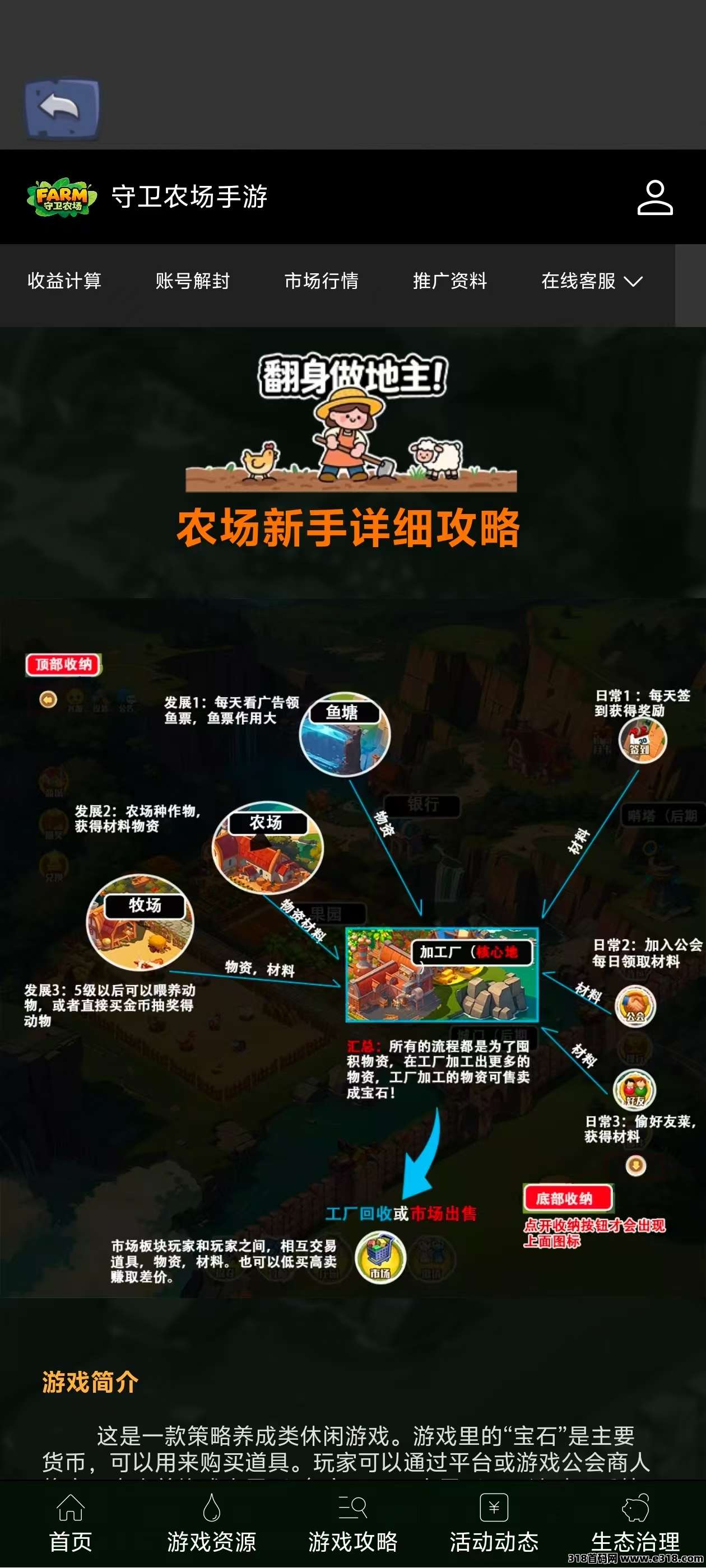 1.开局资源:新手玩家背包里有:100金币、3个包菜种子、5包普通饲料。2.目标:通过农场种植、牧场养殖,收集“水滴”、“木材”、“骨头”、普通作物等材料,加工变卖为宝石。