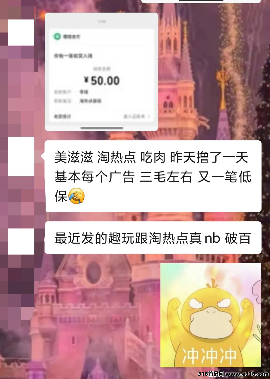 淘热点,一条广告至少一毛多,自己玩一天,有个4-5十,满三猫就可以提,一天24小时都可以踢,可以多次踢,秒。别相信里面的广告,然后有的要进app停留10秒才能领取。我自己玩玩也不错。基本都2毛一个,提还有补贴,最近撸广告回暖期 后期给大家多更正 这种暴力的。有问题也可以扫码加我