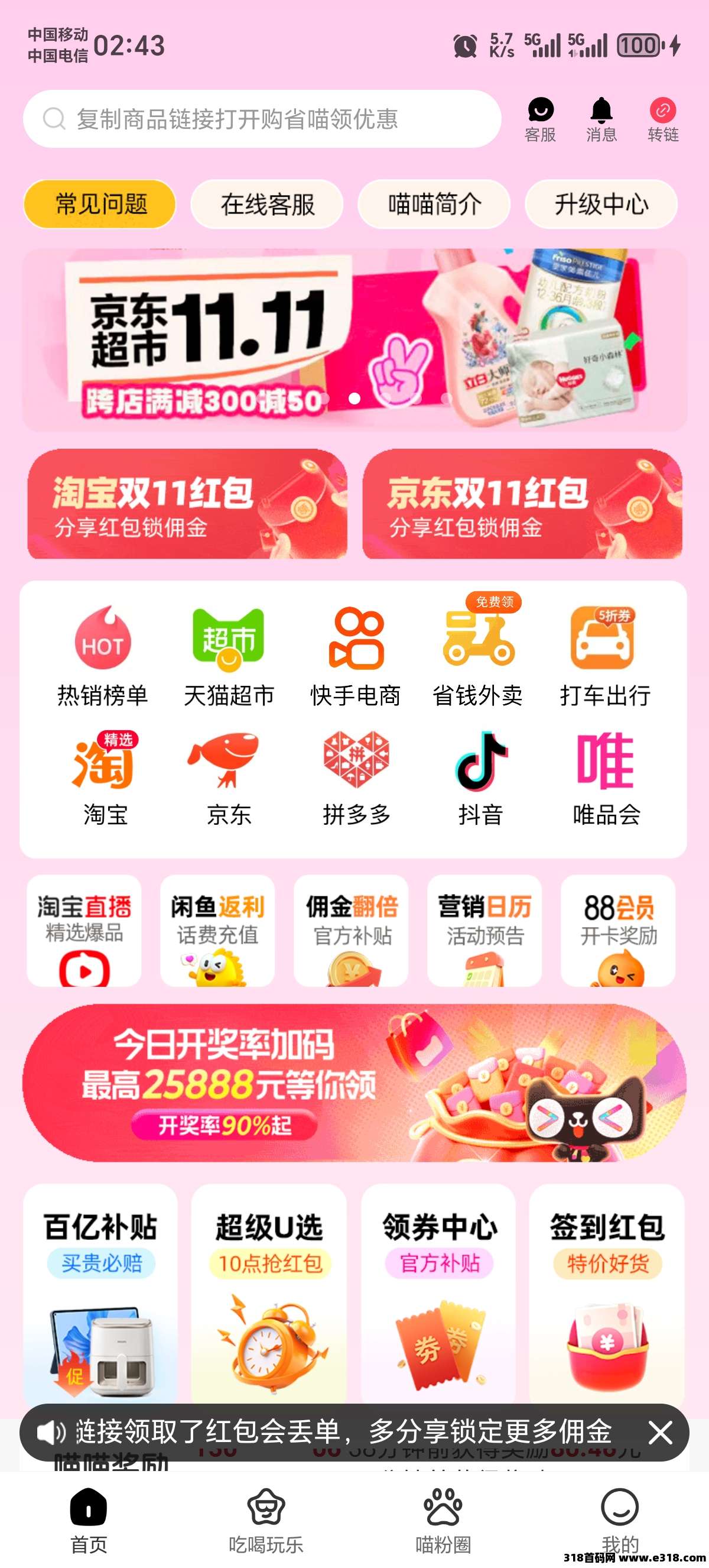 购省喵是一款零投姿、零风险、零门槛的返利APP,成为2025年蕞火副业之一。通过它,你不仅能享受各大电商平台的购物优惠,还能获得返利收入。无论你是淘宝、京东、抖音、快手,还是阿里巴巴的购物爱好者,都可以通过这款APP轻松实现购物返利,边购物边赚钱。