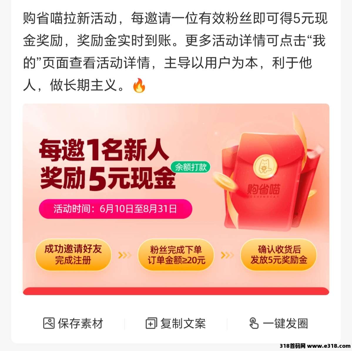 邀好友下载购省喵并完成购物,你将获得佣金奖励,且可以享受好友消费的部分返利收入,让收入来源更加多样。