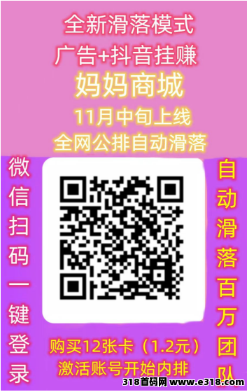 爱妈妈商城,是由江苏爱妈妈公司开发,以打造国内最大的轻创业品牌,11月15号左右APP正式上线,同时开通聊天、建群版块。看广告0撸版块:看12个广告解锁12层约80万人的收益,日收入4位数起步,造血功能源源不断……商城消费版块:自愿消费解锁12层的分润,推广可获得价值500万的**股权。史无前例的点位永动模式全球首创,助力你的推广引流、团队消费和自动裂变!提现无限制,不实名认证。