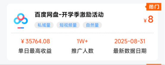 如今云存储已成全民刚需,百度网盘拉新“永远有市场”。比起“做一阵就停”的短期副业,这里的每一份资源、每一个用户,都在为长期收益铺路:今天分享的资料明年可能仍有下载收益,今天注册的用户未来几年或持续带来分成。