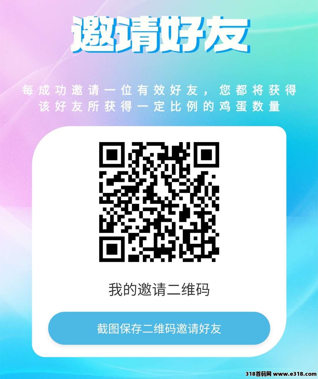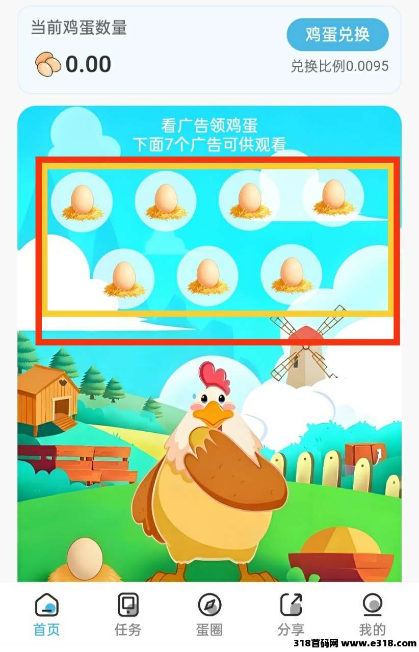 一个蛋蛋白嫖,裂变快。玩家每日观看7个广告获得1.3米收益,集满1000个鸡蛋兑换9.5米,鸡蛋价值每天上涨,最低0.1米起提。邀请好友可享直推30%、间推20%的高额分成奖励。团队规模达到50人后,还可参与鸡蛋芬红,共享额外收益。活动简单易参与