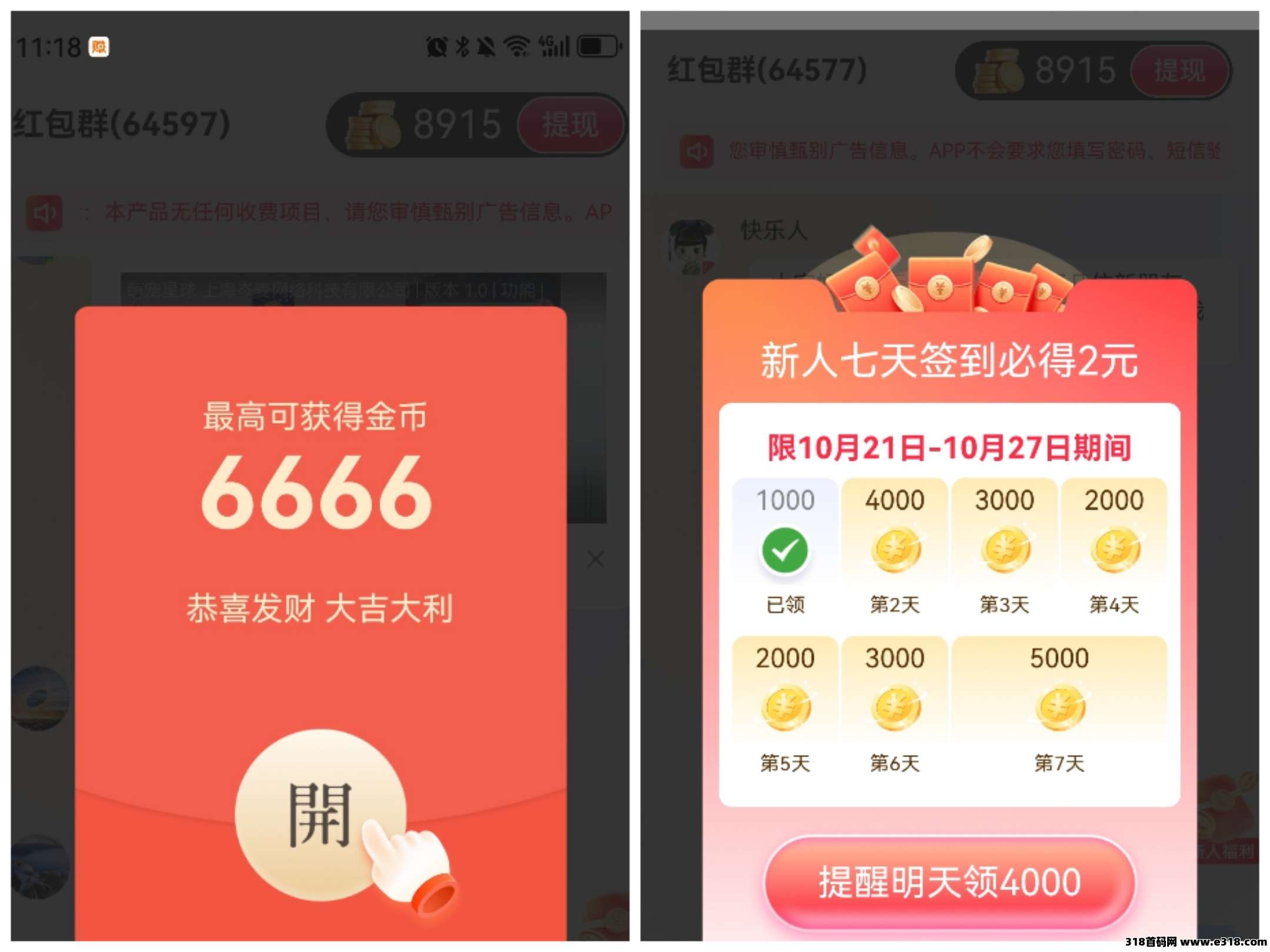 每天拿下签到奖励,连续签到7天2元,如果没看到8个广告0.5元低保,就得去红包群领几个红包后触发。