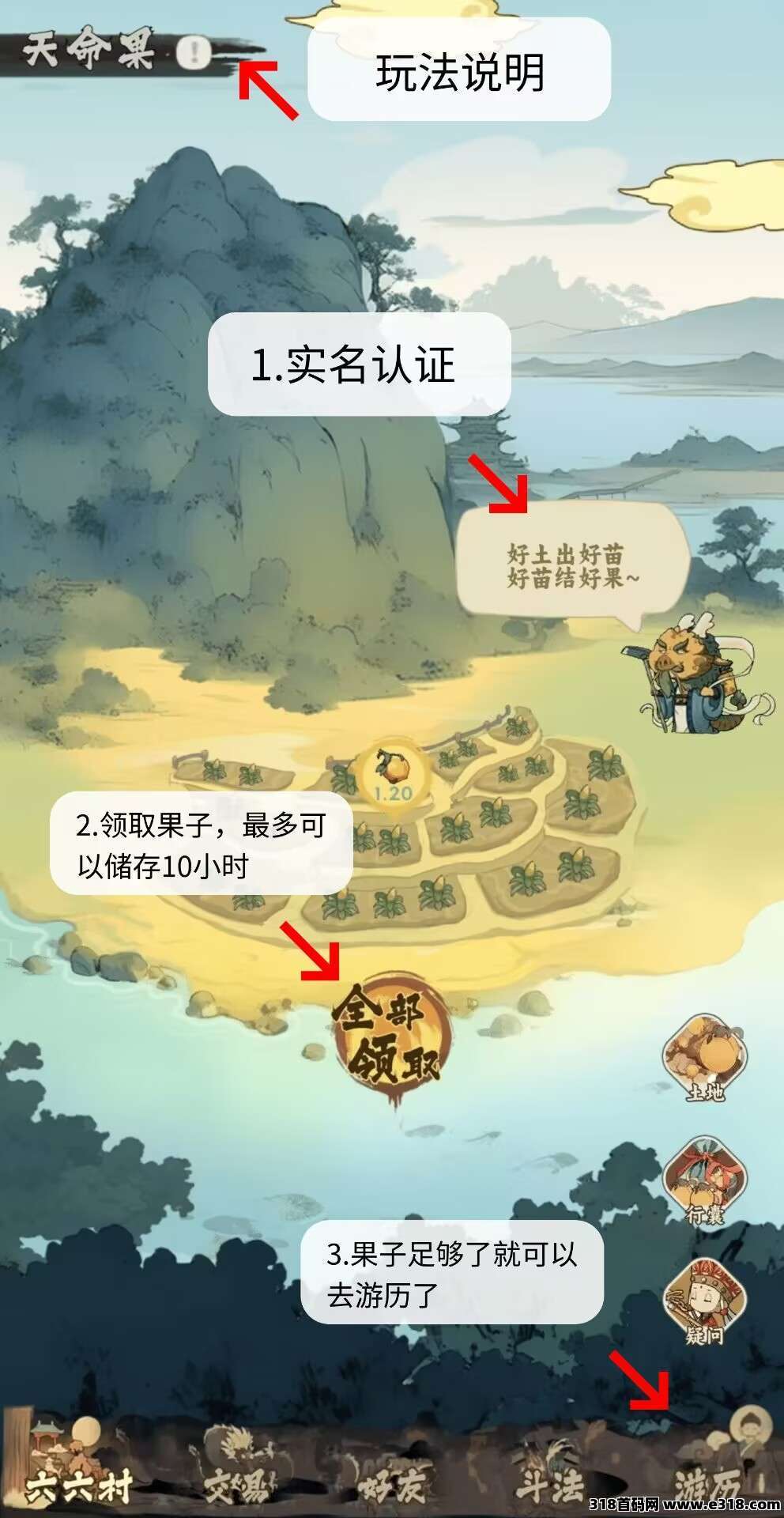 注册实名zfb授权后,免费激活在六六村开通第一块田地,产出天命果,天命果(相当于体力),每小时0.5个,最多存5个,所以10个小时内要去领取一次,要不不会产出天命果,领取果子后又会产出,