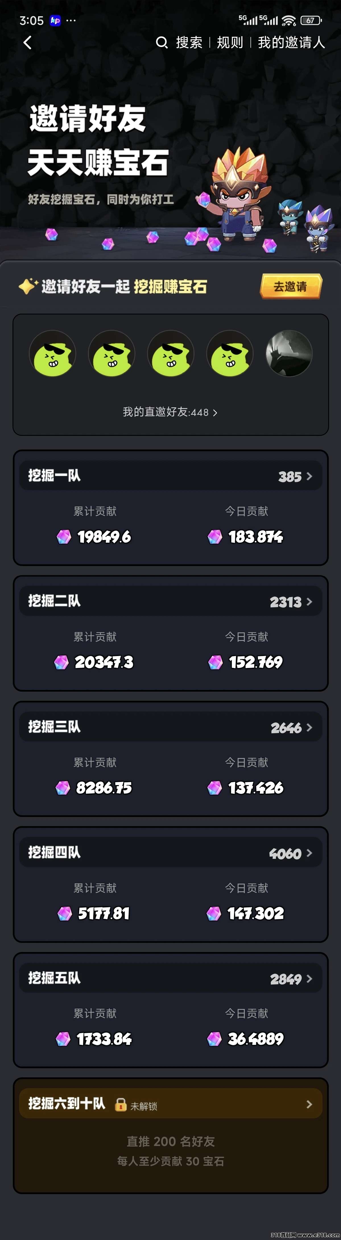 邀请裂变:每邀请1人开盲盒,得10魔石用于工人突破,还可解锁额外盲盒资格,好友产宝石的7%**(直推)+3%**(间推)。
