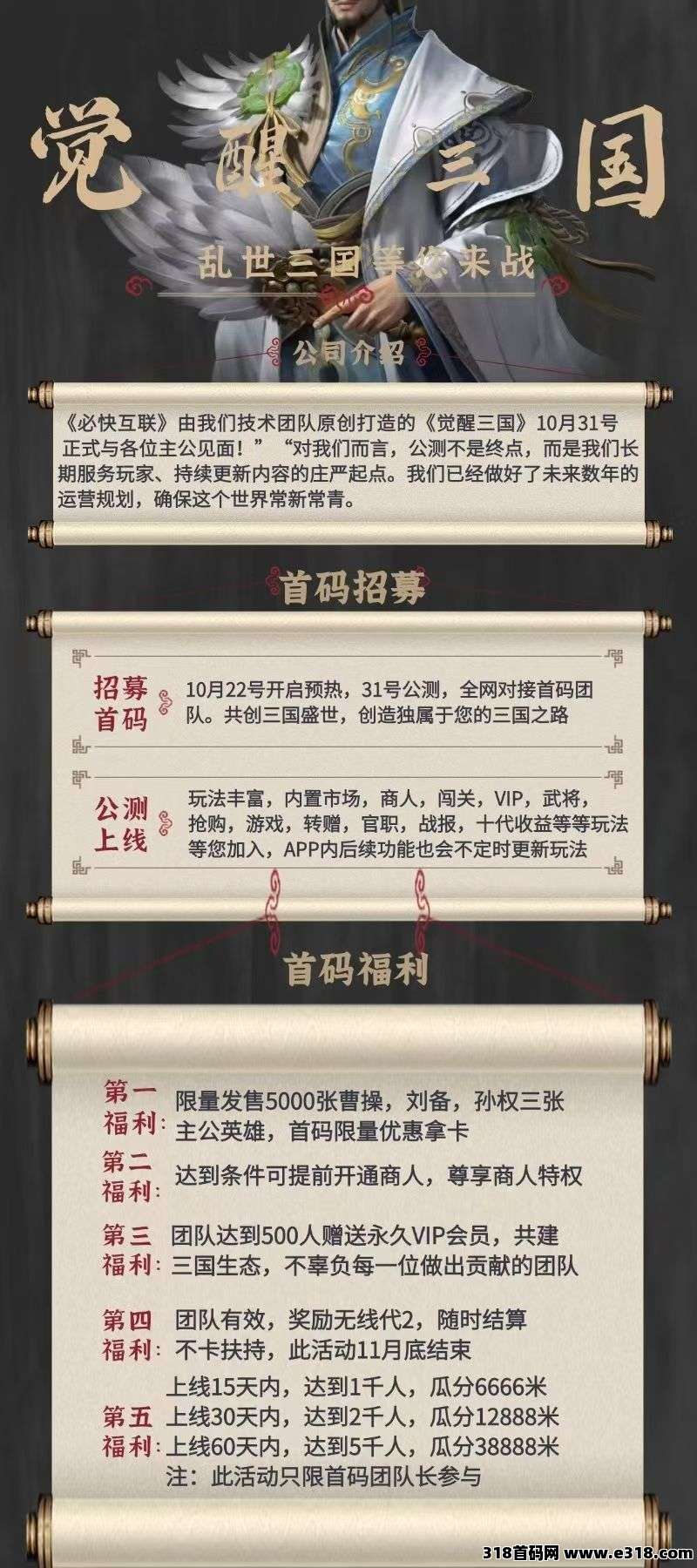 招募10月22号开启预热,31号公测,全网对接首码团