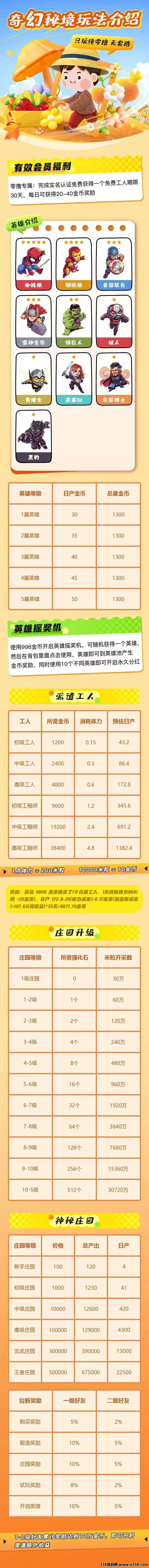 完成实名认证,就可获得平台免费空投的英雄一名英雄30天周期,平台为了防止工作室坚决采用一人一号,让大家人人平等,点击首页按钮,派遣工作,工人工作需要消耗体力,每日0撸完成广告以及其他任务获得体力工人产出米粒之后售卖获得金币,1天约等于30-50奇幻庄园扶持
