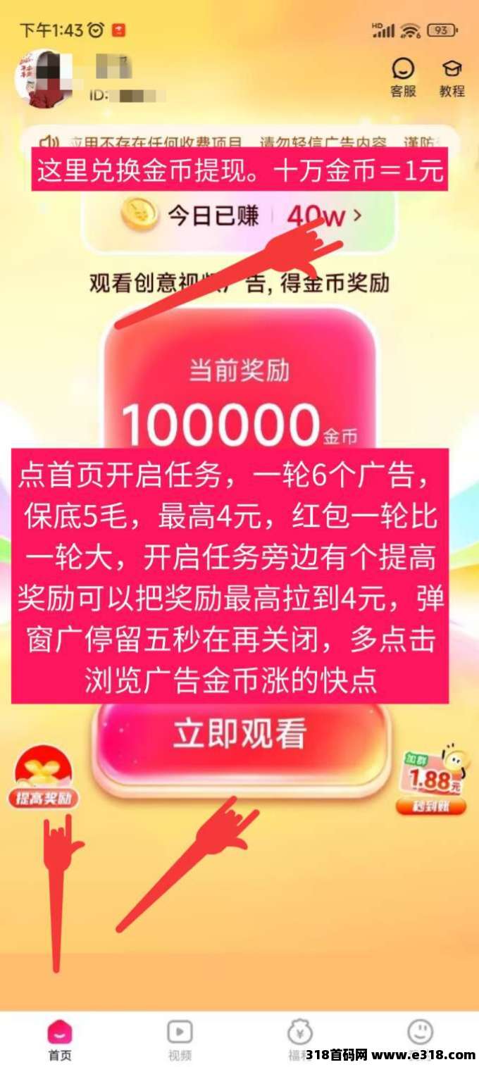 简玩模式,保底一轮六个广告0.5米,顶包4米,奖励无上限,玩法:登陆后首页点击立即开启按钮,即可开启任务,可点击提高奖励,每看一个广都会增加金币