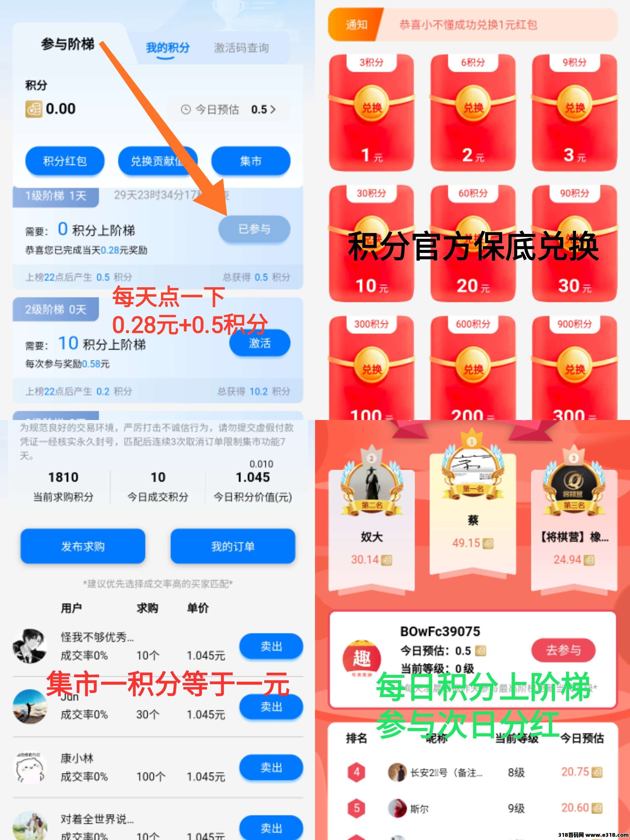 3.推广:每日可获得2.74现金红包+积分。8重福利+20%下级积分,积分越滚越多,以上1积分=1米,集市交易,或者官方兑换红包