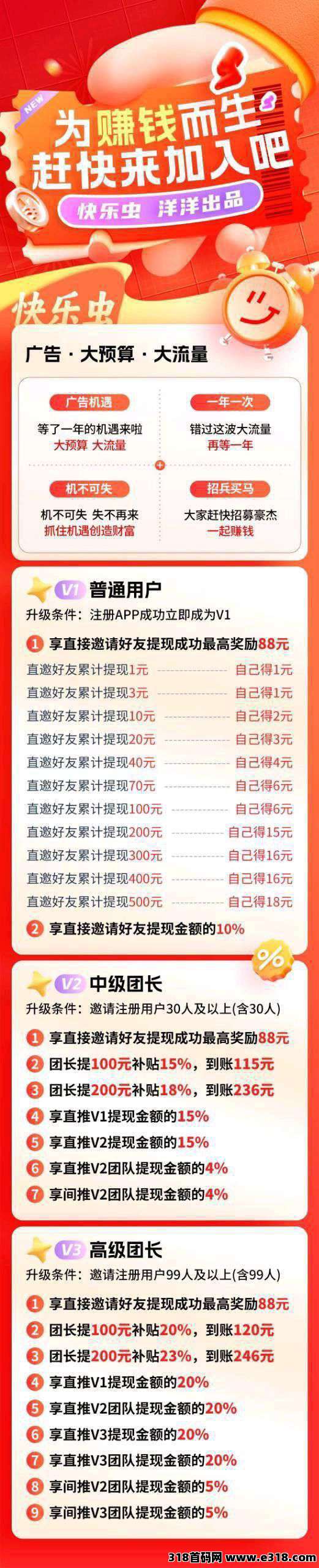 首码快乐虫,看广告,不养机保底收益高,速提现,每天轻松赚米!